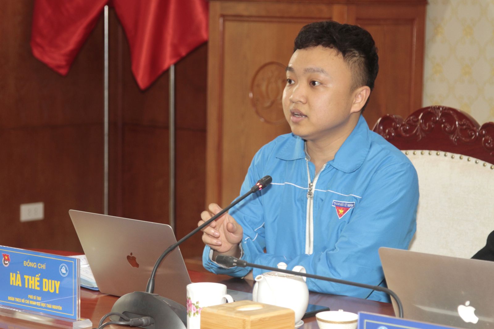 Đồng chí Hà Thế Duy, Phó Bí thư Đoàn Thanh niên Đại học Thái Nguyên phát biểu tại hội nghị.