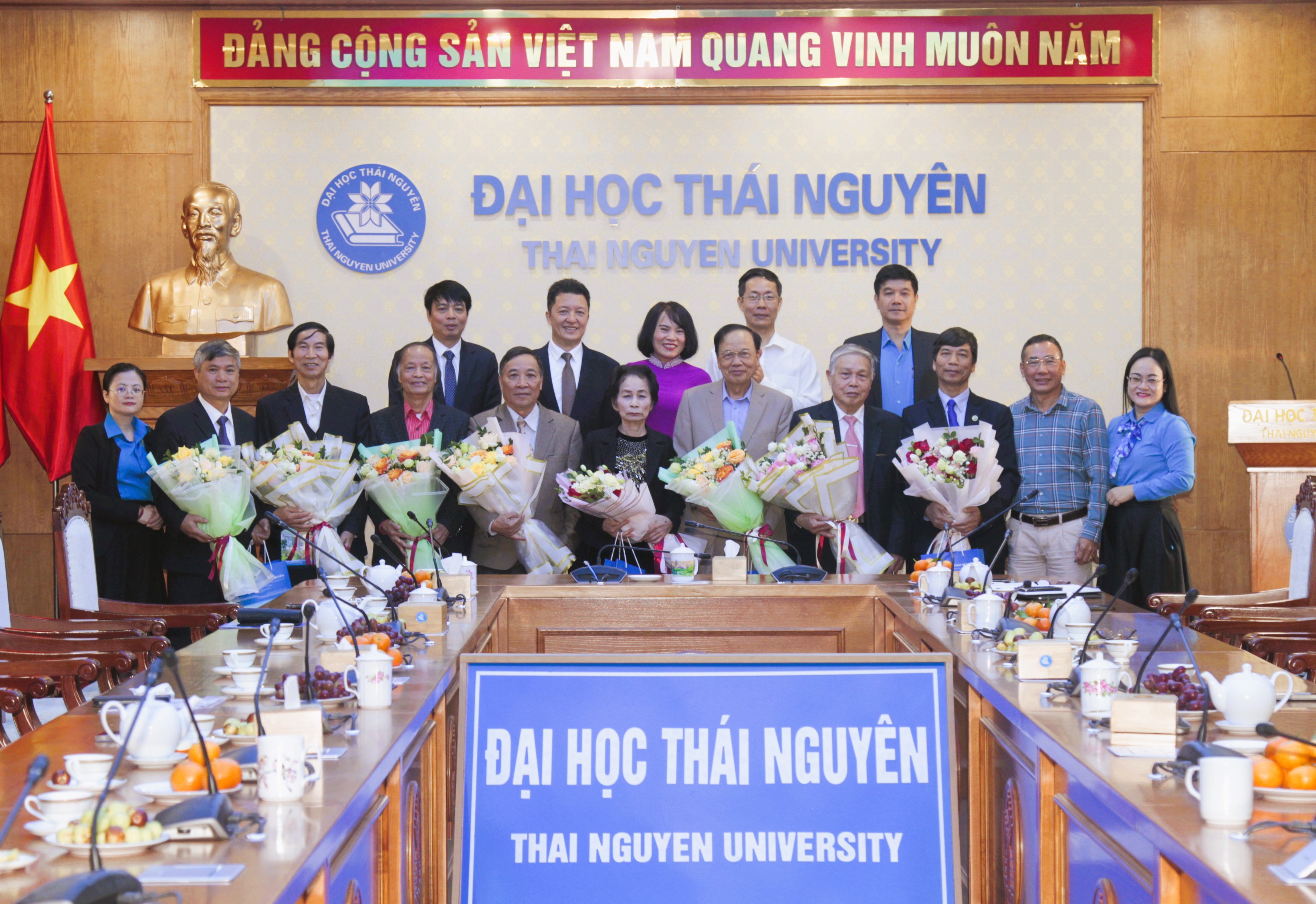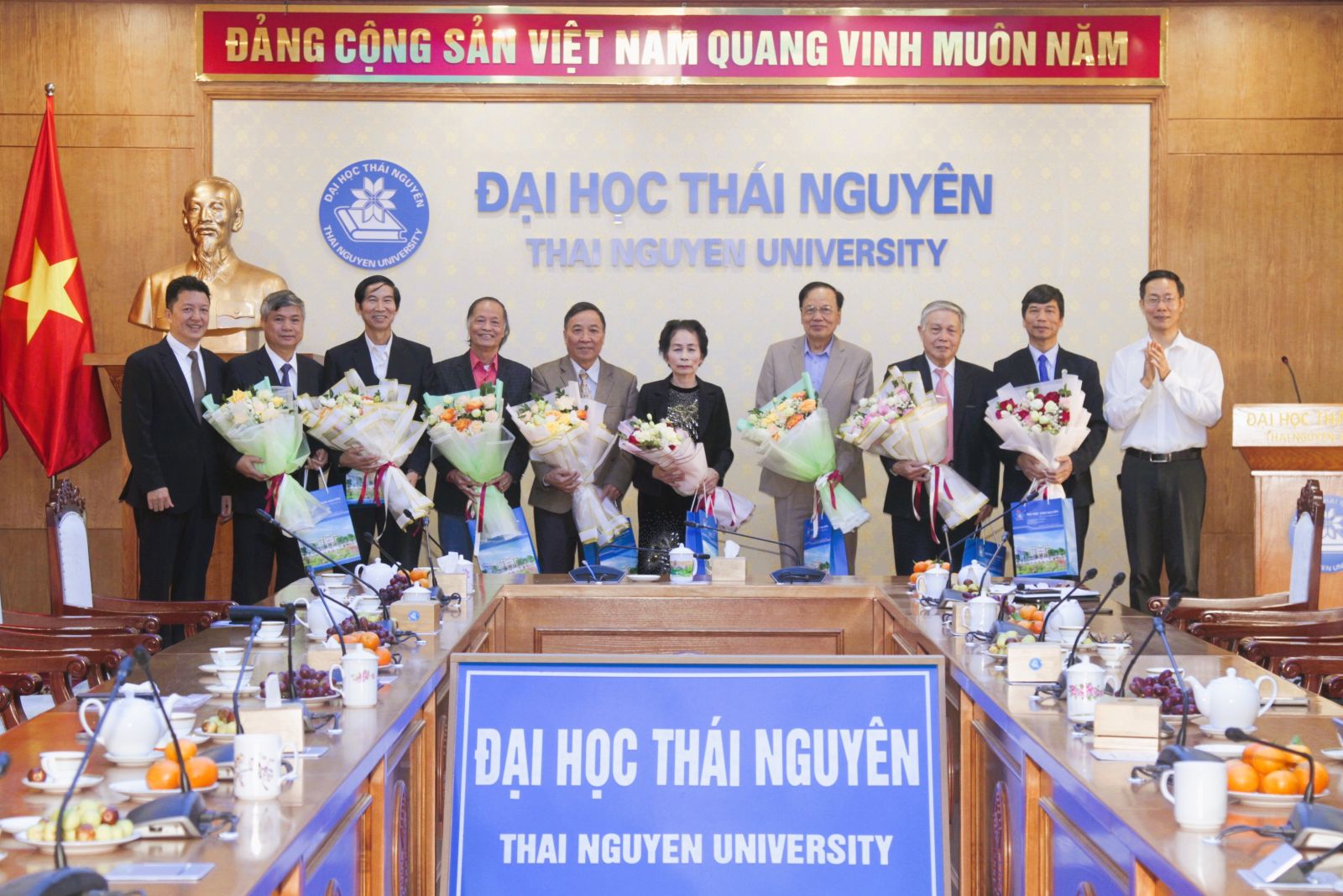 Đại diện lãnh đạo Đại học Thái Nguyên tặng hoa chúc mừng các đồng chí nguyên Chủ tịch, Phó Chủ tịch Công đoàn Đại học Thái Nguyên qua các thời kỳ.
