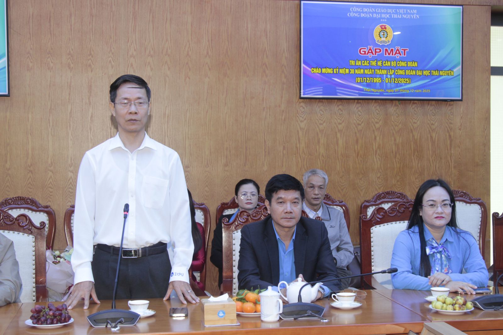 Phát biểu tại buổi gặp mặt, TS. Nguyễn Văn Tảo, Bí thư Đảng ủy Đại học Thái Nguyên đã gửi lời chúc mừng và tri ân sâu sắc các thầy cô, các thế hệ cán bộ Công đoàn đã có nhiều đóng góp trong sự phát triển chung của Đại học Thái Nguyên. TS. Nguyễn Văn Tảo ghi nhận và đánh giá cao vai trò của Công đoàn Đại học Thái Nguyên, đã khẳng định vai trò là tổ chức đại diện tin cậy của đoàn viên, viên chức, người lao động trong toàn Đại học; là cầu nối quan trọng giữa Đại học, đơn vị với đoàn viên và các cấp Công đoàn. Trong suốt quá trình xây dựng và phát triển, hoạt động Công đoàn đã góp phần vào việc thực hiện thắng lợi nhiệm vụ chính trị của Đại học Thái Nguyên. Công đoàn Đại học Thái Nguyên và các cấp Công đoàn trong Đại học đã thực hiện tốt nhiệm vụ và đã để lại dấu ấn quan trọng, góp phần xây dựng nền tảng tổ chức vững mạnh, từng bước đổi mới nội dung, phương thức hoạt động phù hợp với yêu cầu phát triển giáo dục đại học và yêu cầu chuyển đổi số.