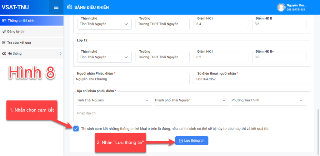 (xem hình 8 dưới) ở đầu dòng chữ “Thí sinh cam kết những thông tin kê khai ở trên là đúng, nếu sai thí sinh có thể sẽ bị hủy tư cách dự thi và kết quả thi” và nhấn “Lưu thông tin”.