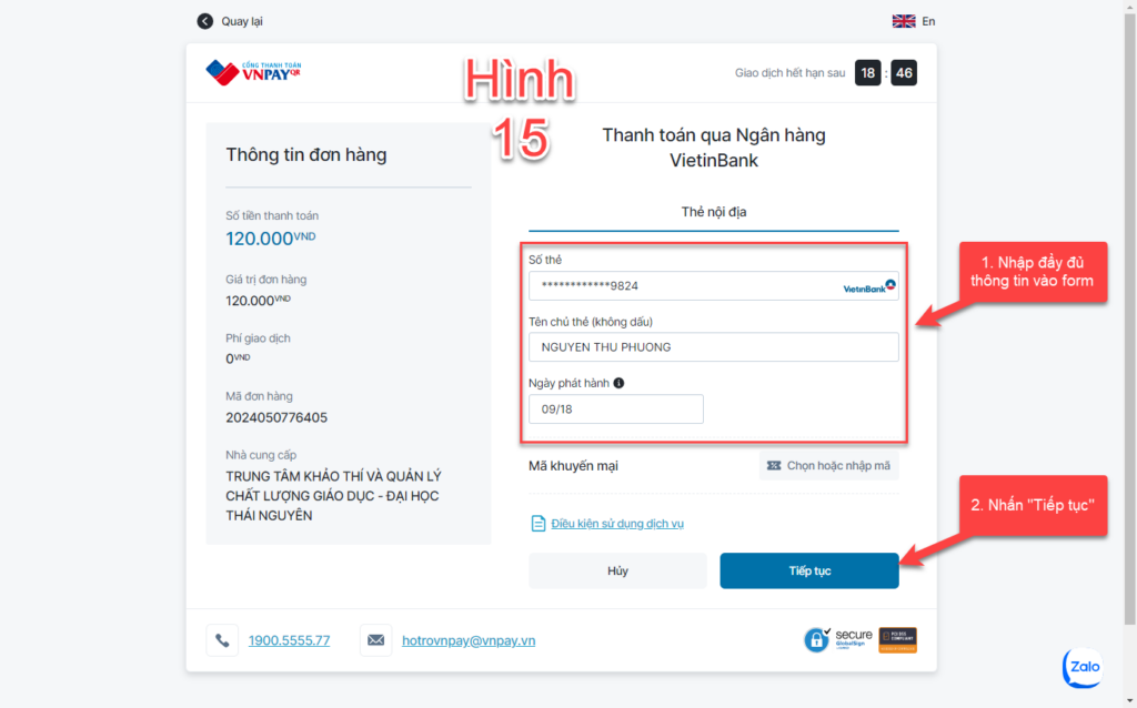 - Thí sinh nhập đầy đủ thông tin về số thẻ, tên chủ thẻ (không dấu) và ngày phát hành được in nổi trên thẻ ngân hàng của thí sinh vào form, sau đó nhấn “Tiếp tục” (xem hình 15 dưới):