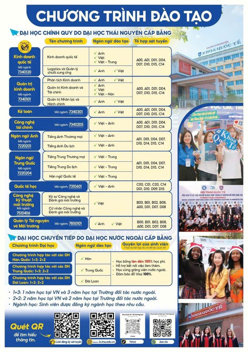 Đặc biệt, sinh viên theo học tại khoa có cơ hội nhận học bổng lên đến 100% học phí, được học tập cùng giảng viên nước ngoài và hỗ trợ kết nối việc làm thêm. Với hơn 98% sinh viên tốt nghiệp có việc làm ổn định, Khoa Quốc tế (Đại học Thái Nguyên) đang trở thành một trong những lựa chọn cho các thí sinh trong mùa tuyển sinh năm 2026.