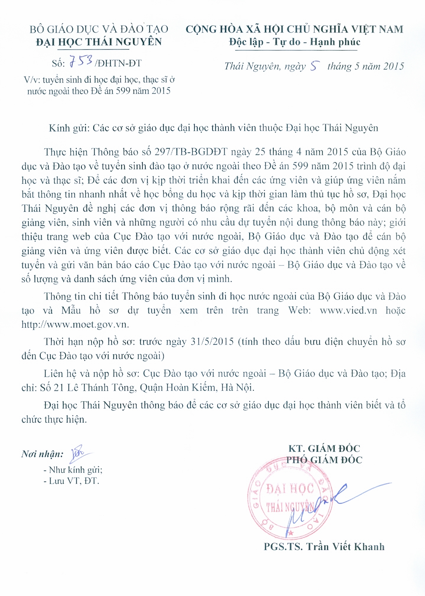 Thông báo tuyển sinh đi học đại học, thạc sĩ ở nước ngoài theo Đề án 599 năm 2015 Ngày cập nhật : Thứ ba , 05/05/2015 | 00:00 Sao chép liên kết