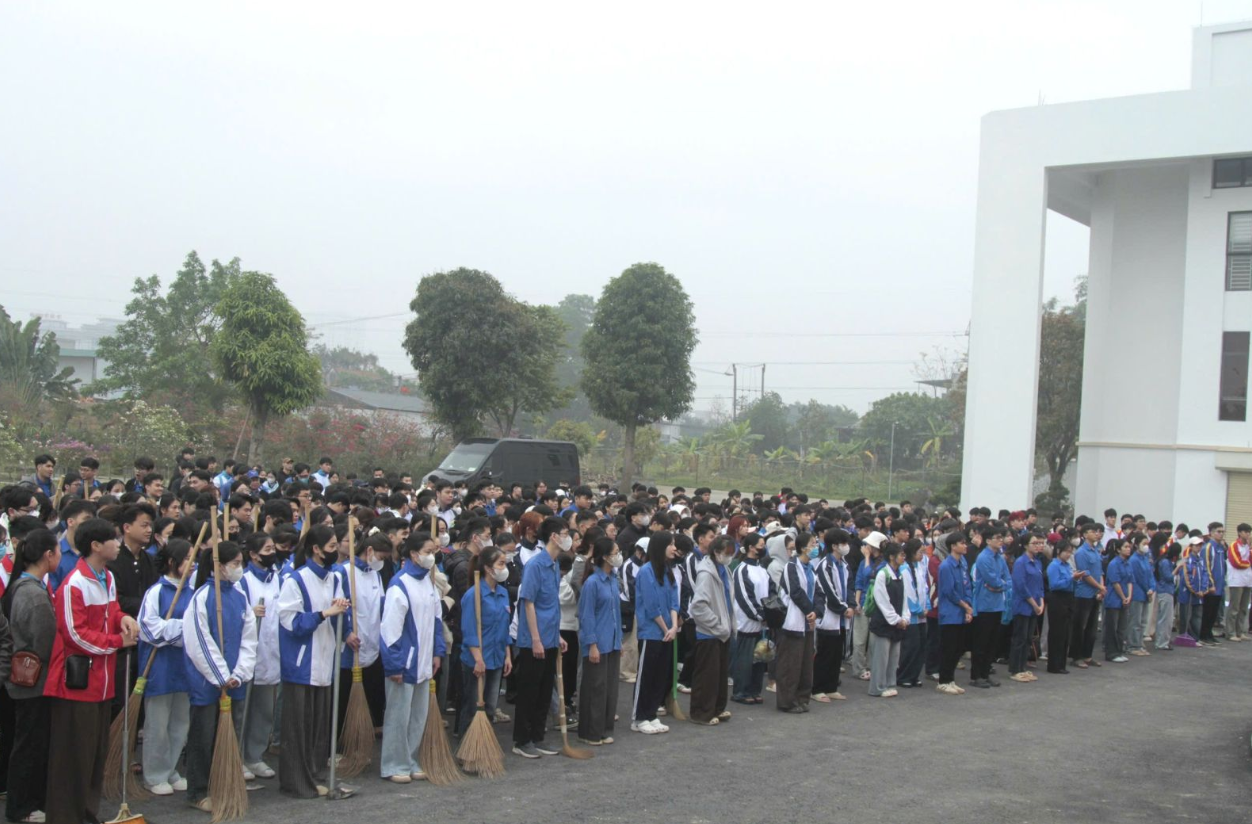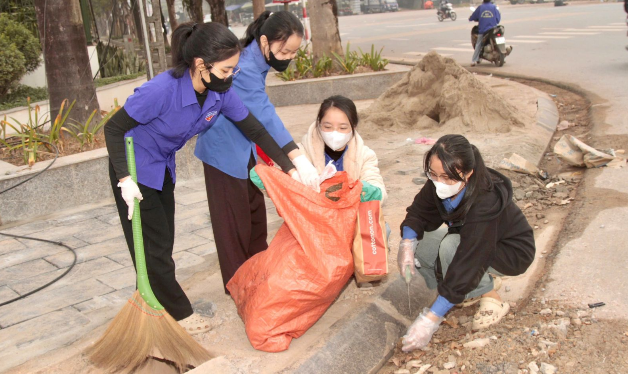 Photo: Youth Union members and students actively participating in environmental sanitation and waste collection activities.