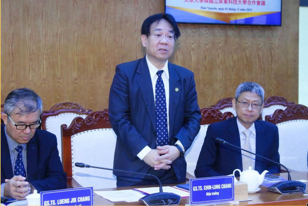 On the morning of November 3, Assoc. Prof. Dr. Hoang Van Hung, President of Thai Nguyen University (TNU), chaired a working session with the delegation from the National Pingtung University of Science and Technology (NPUST, Taiwan), led by Prof. Dr. Chin-Lung Chang, President of NPUST. The NPUST delegation included representatives from the Office of International Affairs, the International College, the Colleges of Agriculture, the Colleges of Veterinary Medicine, the Department of Plant Industry, and the Department of Food Science. Representing Thai Nguyen University were leaders from the Department of Science, Technology and International Affairs; the Department of Academic and Student Affairs; International School; and the Center for Training, Fostering, and International Development.