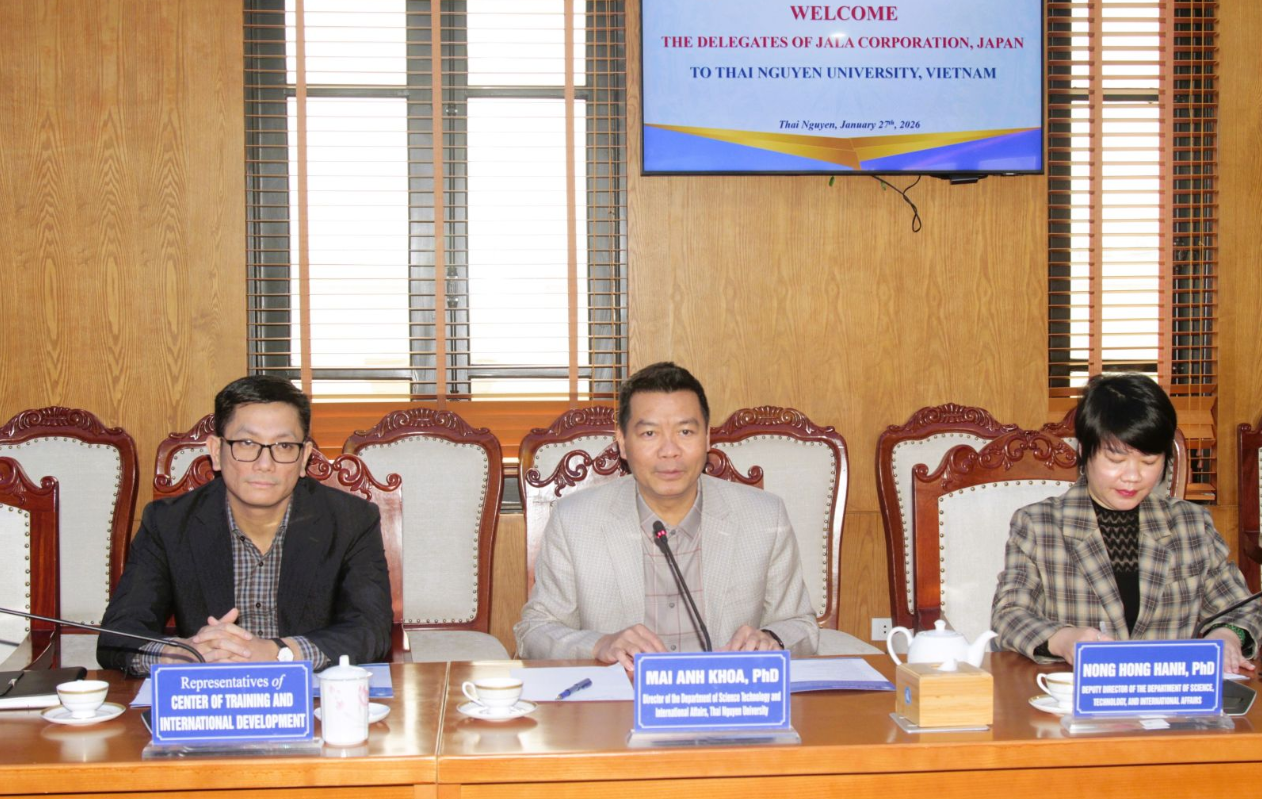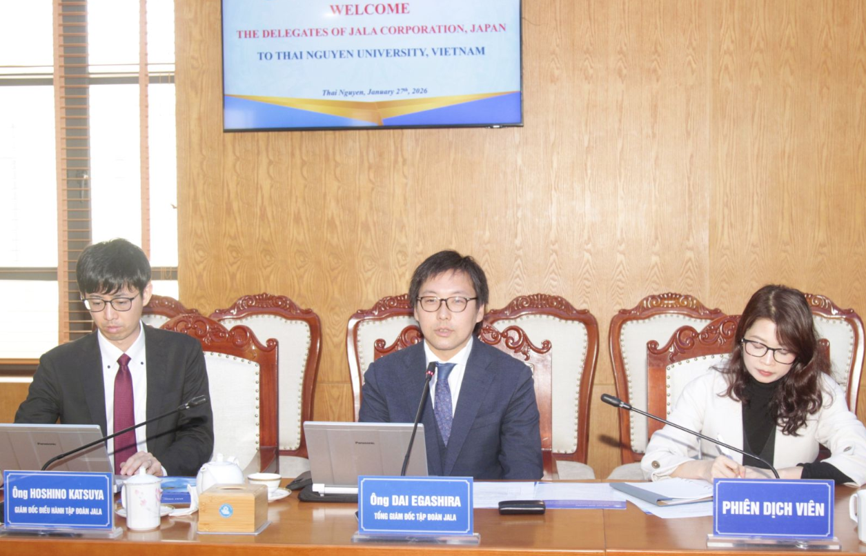 On January 27th, Thai Nguyen University (TNU) held a working session with a delegation from JALA Corporation, Japan. The delegation included Mr. Dai Egashira, President and Chief Executive Officer of JALA Corporation, Mr. Hoshino Katsuya, Executive Director of JALA Corporation and along with representatives of WSY Vietnam Co., Ltd.