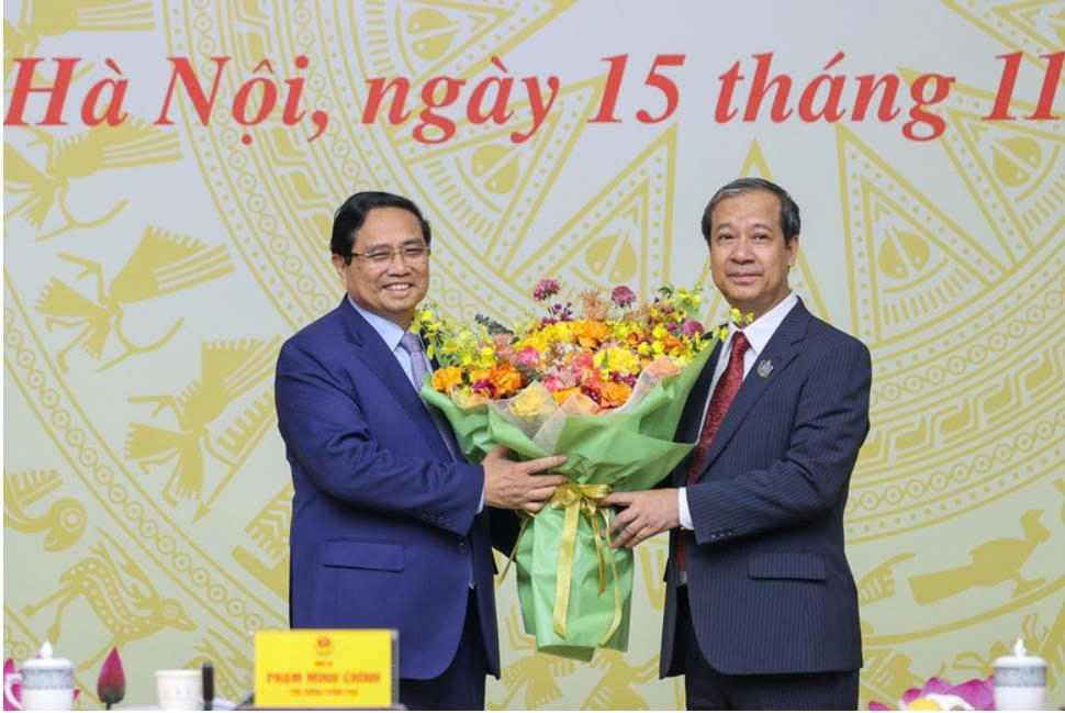 Photo: Minister Nguyễn Kim Sơn presenting flowers to the Prime Minister in celebration of Vietnamese Teachers’ Day – VGP