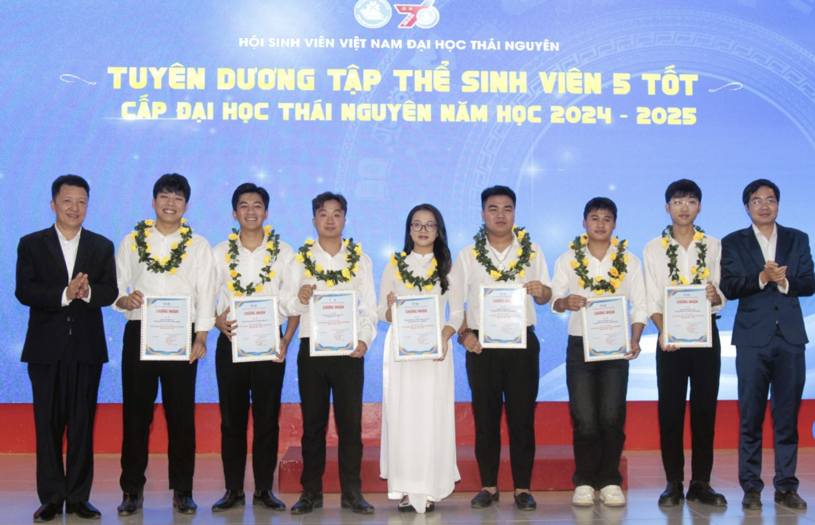 Photo: Assoc. Prof. Nguyen Thanh Ha congratulated the 07 collectives awarded the “Students with five-distinction aspects” title at Thai Nguyen University for the 2024–2025 academic year