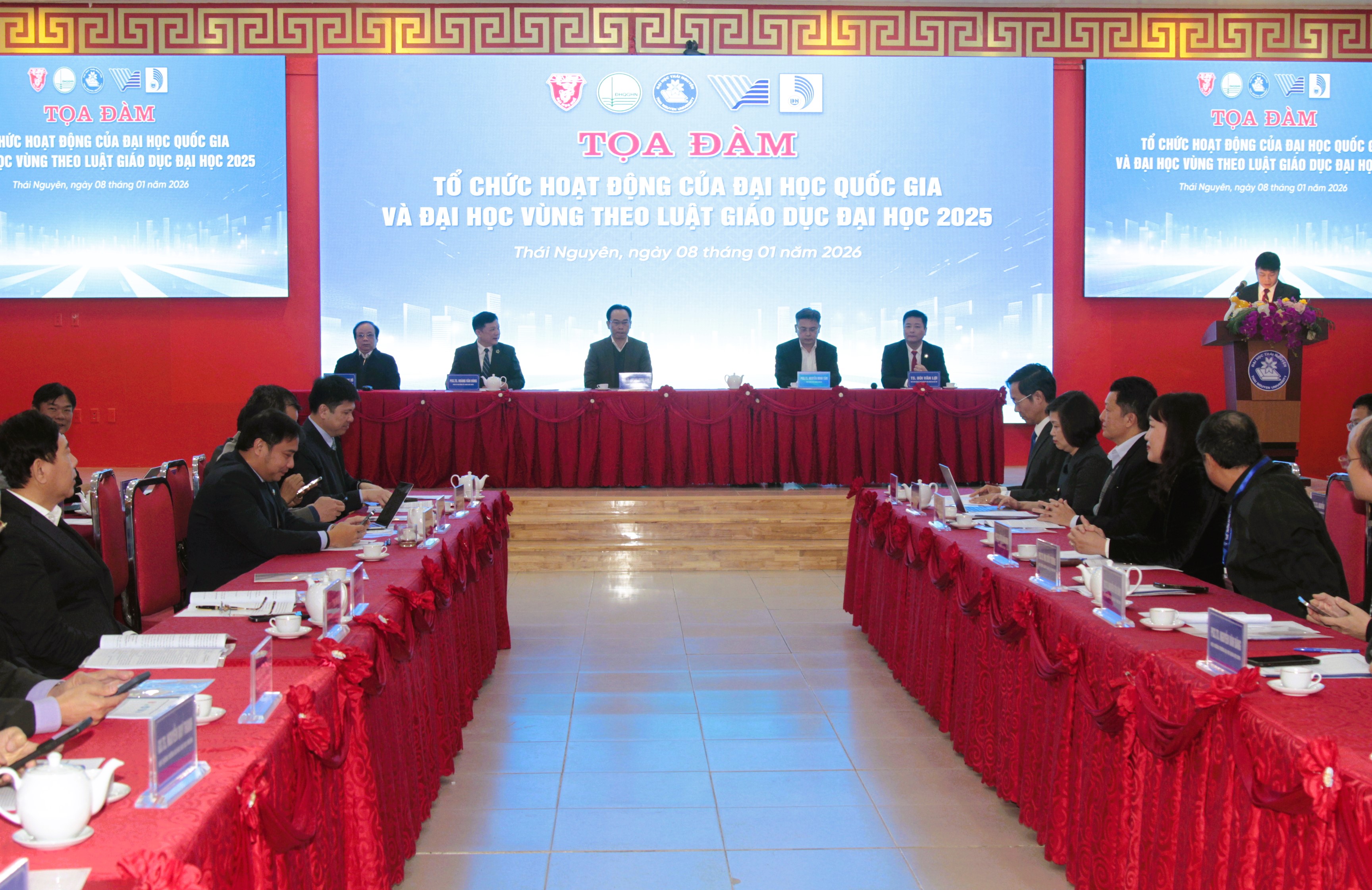 Tham dự Toạ đàm có PGS.TS. Hoàng Minh Sơn, Bí thư Đảng ủy, Giám đốc Đại học Quốc gia Hà Nội; PGS.TS. Nguyễn Minh Tâm, Phó Giám đốc Đại học Quốc gia TP. Hồ Chí Minh; PGS.TS. Nguyễn Ngọc Vũ, Giám đốc Đại học Đà Nẵng; TS. Bùi Văn Lợi, Phó Giám đốc phụ trách Đại học Huế; cùng đại diện lãnh đạo Văn phòng, các Ban chức năng của các Đại học Quốc gia, Đại học vùng.