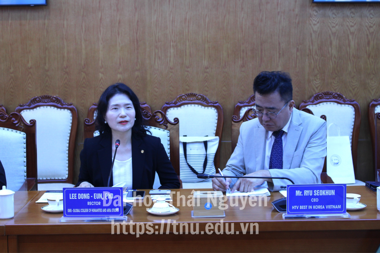 Đại diện Đại học Kookmin bày tỏ cảm ơn sự đón tiếp trọng thị của Đại học Thái Nguyên; đồng thời giới thiệu về nhà trường được thành lập năm 1946 tại Seoul, hiện có 13 đơn vị đào tạo trực thuộc với quy mô khoảng 23.000–25.000 sinh viên. Trường đào tạo đa dạng từ bậc đại học đến sau đại học với 49 chuyên ngành đại học, 34 chuyên ngành thạc sĩ và 28 chuyên ngành tiến sĩ trong các lĩnh vực như kinh tế, kỹ thuật, công nghệ thông tin và nghệ thuật. Với mạng lưới hợp tác quốc tế rộng khắp, Đại học Kookmin mong muốn thúc đẩy trao đổi giảng viên, sinh viên và hợp tác nghiên cứu khoa học với Đại học Thái Nguyên.