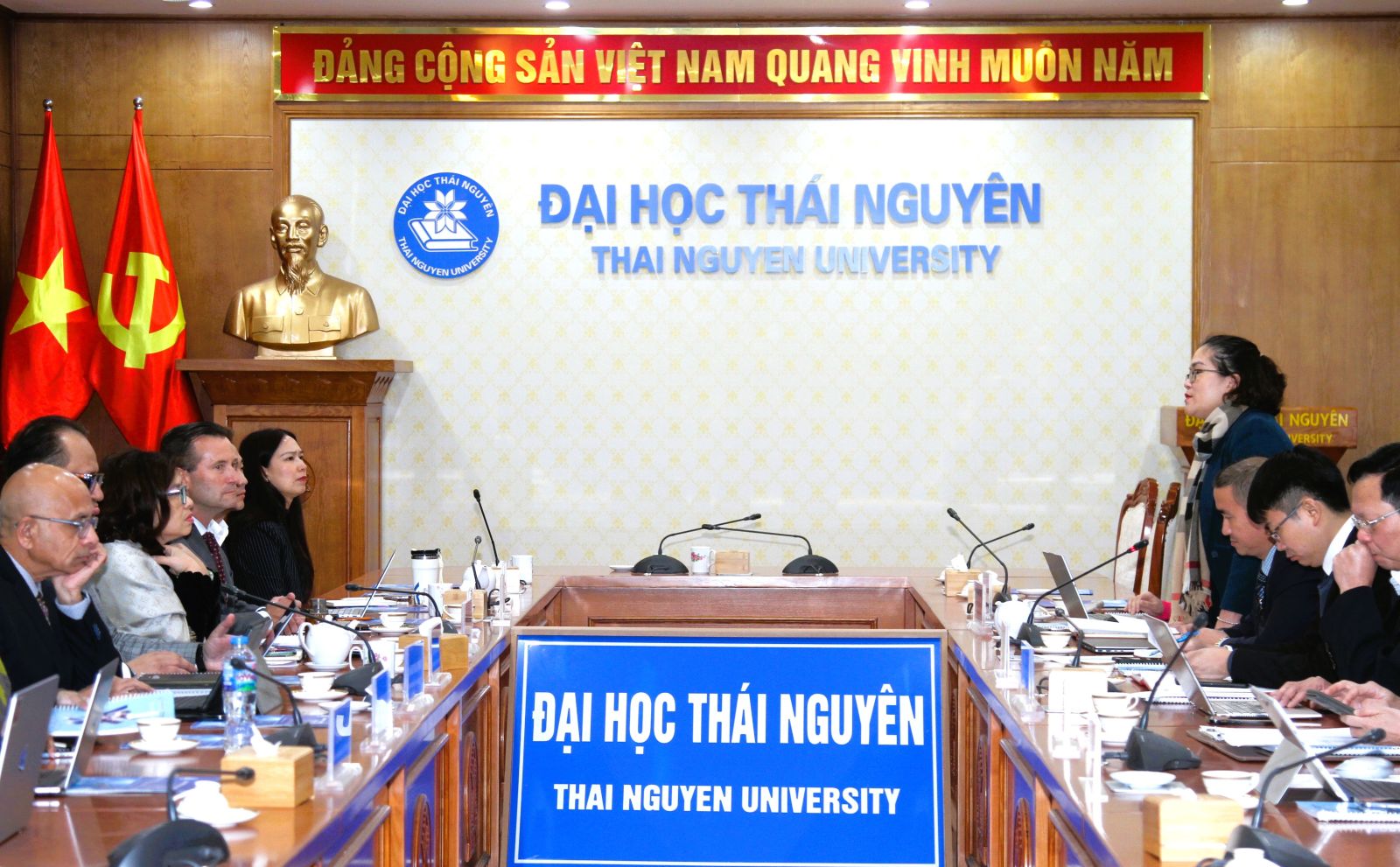 Phát biểu tại buổi làm việc, đại diện lãnh đạo Ban Khoa học Công nghệ và Đối ngoại đã giới thiệu khái quát về vị thế, tiềm năng và định hướng phát triển của Đại học Thái Nguyên trong lĩnh vực đào tạo và nghiên cứu khoa học; trong đó nhấn mạnh các hoạt động nghiên cứu gắn với phát triển bền vững và đáp ứng yêu cầu thực tiễn của khu vực Trung du và Miền núi phía Bắc. Hiện nay, Đại học Thái Nguyên có 14 đơn vị đào tạo, gần 4.000 cán bộ, trong đó hơn 2.500 giảng viên; có 206 giáo sư, phó giáo sư và trên 1.000 tiến sĩ, chiếm khoảng 41% tổng số giảng viên. Quy mô đào tạo năm 2025 đạt trên 115.000 người học.