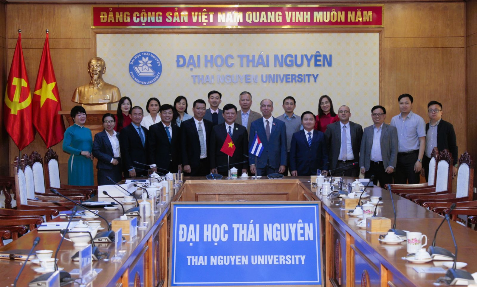 Đoàn công tác Đại sứ quán nước Cộng hòa Cuba tại Việt Nam chụp ảnh lưu niệm với tập thể lãnh đạo, cán bộ Đại học Thái Nguyên.