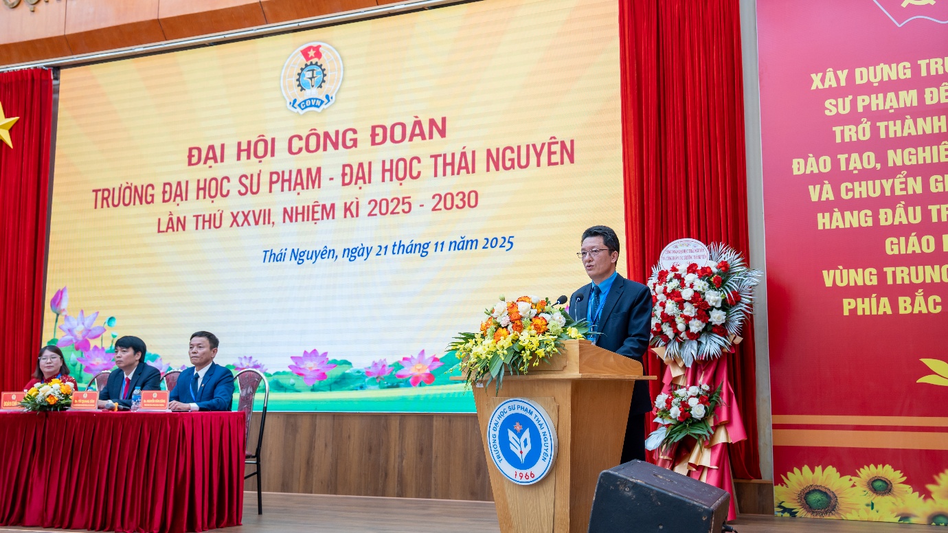 Cũng tại Đại hội, đồng chí Mai Xuân Trường, Phó Bí thư Đảng ủy, Hiệu trưởng đã ghi nhận những thành tích mà Công đoàn Trường đã đạt được trong giai đoạn 2023-2025 và khẳng định Đại hội lần thứ XXVII là sự kiện chính trị quan trọng trong hoạt động của Trường Đại học Sư phạm. Đồng chí cũng mong muốn Ban Chấp hành Công đoàn Trường lần thứ XXVII, nhiệm kỳ 2025-2030 tiếp tục cùng với chính quyền phát huy sức mạnh tập thể, tinh thần đoàn kết, đổi mới nội dung, phương thức hoạt động, tăng cường ứng dụng chuyển đổi số trong các hoạt động để Công đoàn thực sự là tổ chức đại diện, bảo vệ quyền lợi và lợi ích hợp pháp, chính đáng của người lao động, góp phần thực hiện thắng lợi nhiệm vụ chính trị của Nhà trường.
