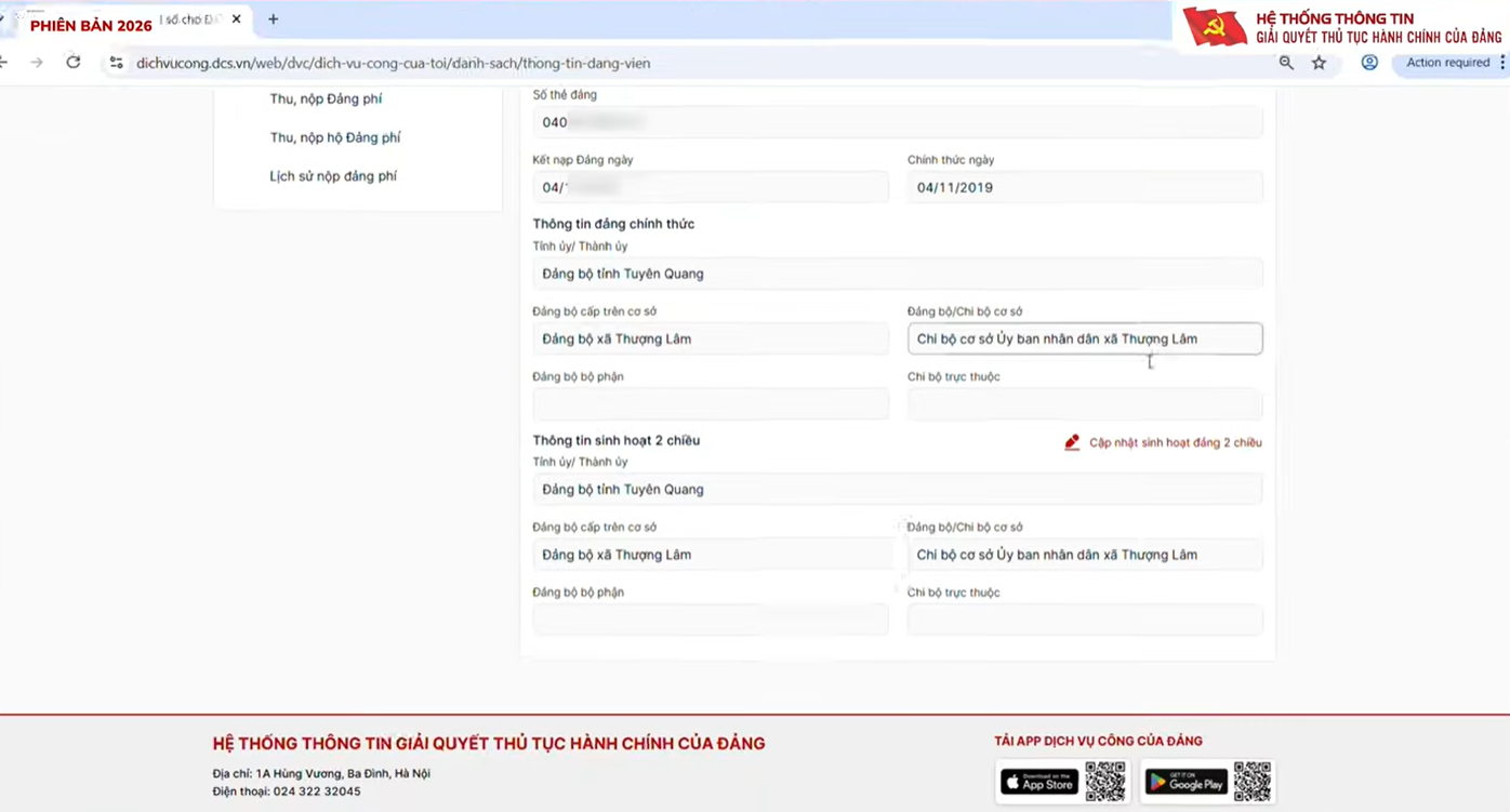Đảng viên có thể truy cập Cổng dịch vụ công của Đảng bằng tài khoản định danh điện tử VNeID để thực hiện các thủ tục và cập nhật thông tin cá nhân. Việc chuyển từ phương thức truyền thống sang môi trường điện tử giúp nâng cao tính chính xác, minh bạch và kịp thời trong xử lý công việc, phù hợp với định hướng xây dựng “Đảng viên số”.