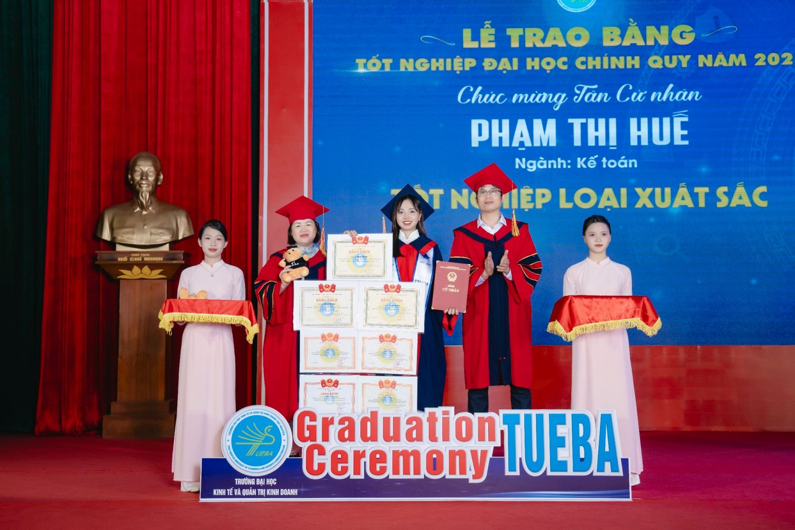 Tân cử nhân Phạm Thị Huế rạng rỡ trong ngày nhận bằng tốt nghiệp, khép lại 4 năm học tập với những thành tích (Nguồn: TUEBA)