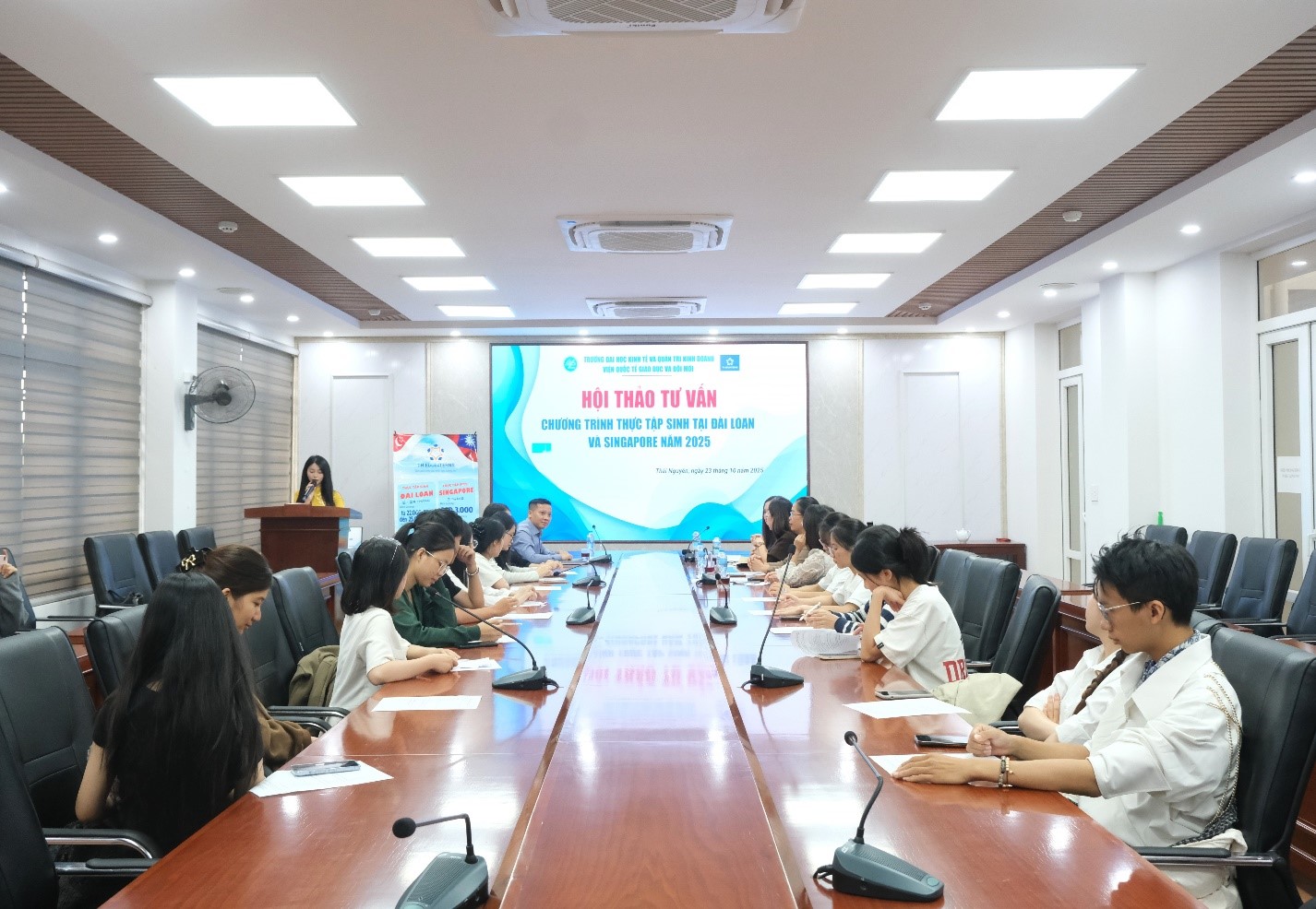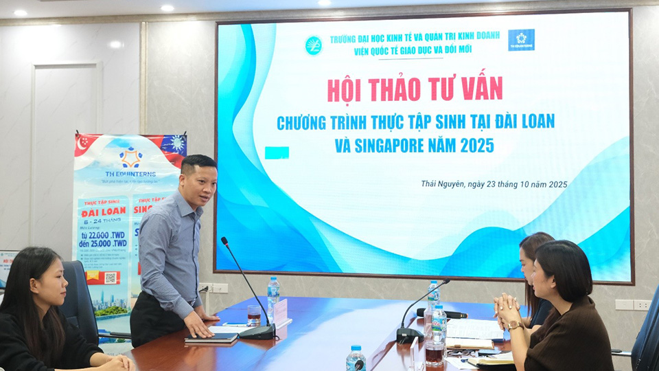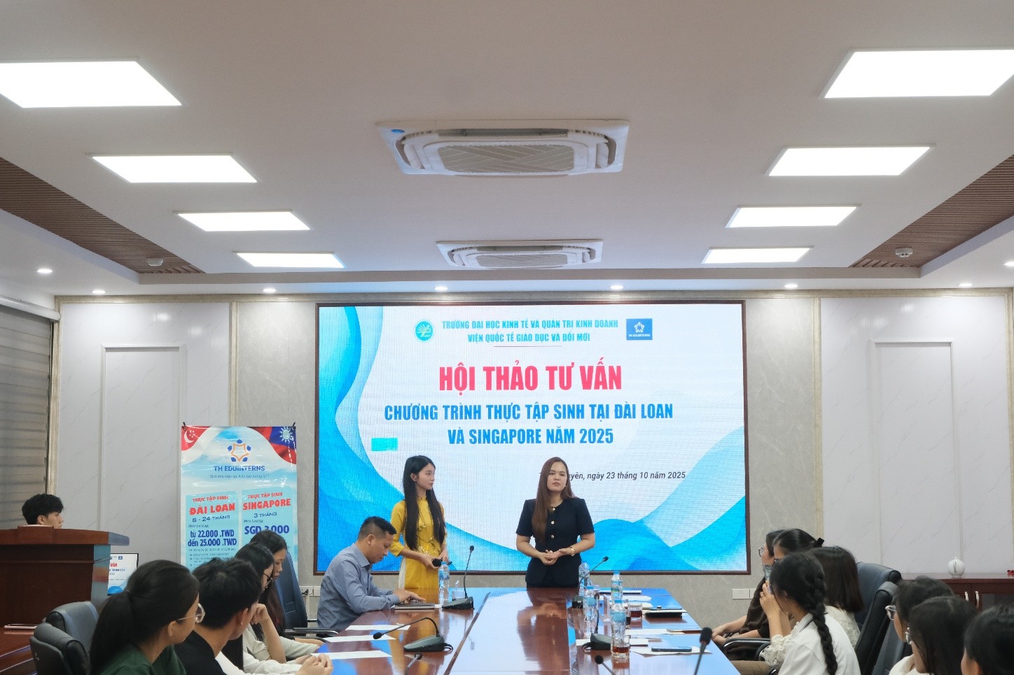 Ngày 23/10/2025, Viện Quốc tế Giáo dục và Đổi mới - Trường Đại học Kinh tế và Quản trị kinh doanh (TUEBA) đã phối hợp với Công ty The Eduinterns tổ chức Hội thảo tư vấn “Thực tập sinh hưởng lương tại Đài Loan và Singapore”. Chương trình nhằm cung cấp thông tin, định hướng và cơ hội cho sinh viên trong việc tham gia các chương trình thực tập quốc tế, góp phần nâng cao năng lực hội nhập và trải nghiệm nghề nghiệp trong môi trường toàn cầu.