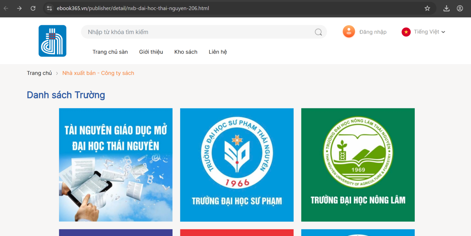 Giao diện Cổng Tài nguyên giáo dục mở ebook365.vn trong giai đoạn 1 xây dựng Kho dữ liệu số của Nhà xuất bản Đại học Thái Nguyên.
