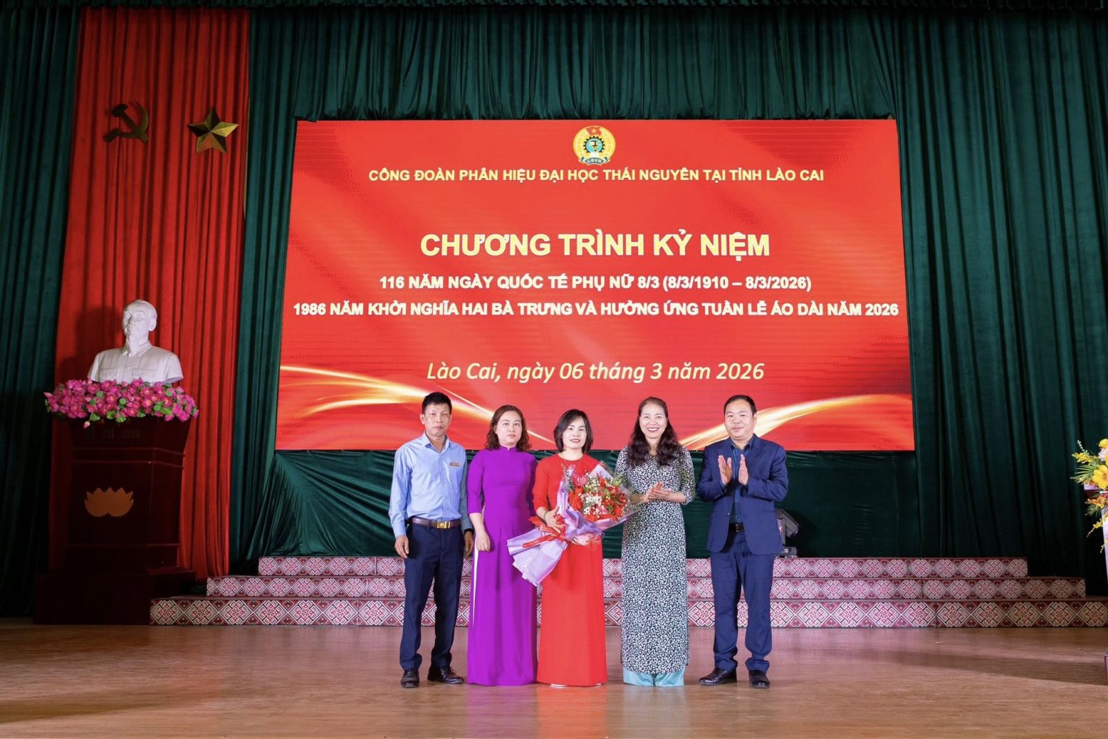 TS. Vũ Thị Bình, Phó Bí thư Đảng ủy, Chủ tịch Công đoàn, Phó Giám đốc Phân hiệu tặng hoa, chúc mừng nữ cán bộ, viên chức và người lao động Phân hiệu (Nguồn: Phân hiệu Đại học Thái Nguyên tại tỉnh Lào Cai).