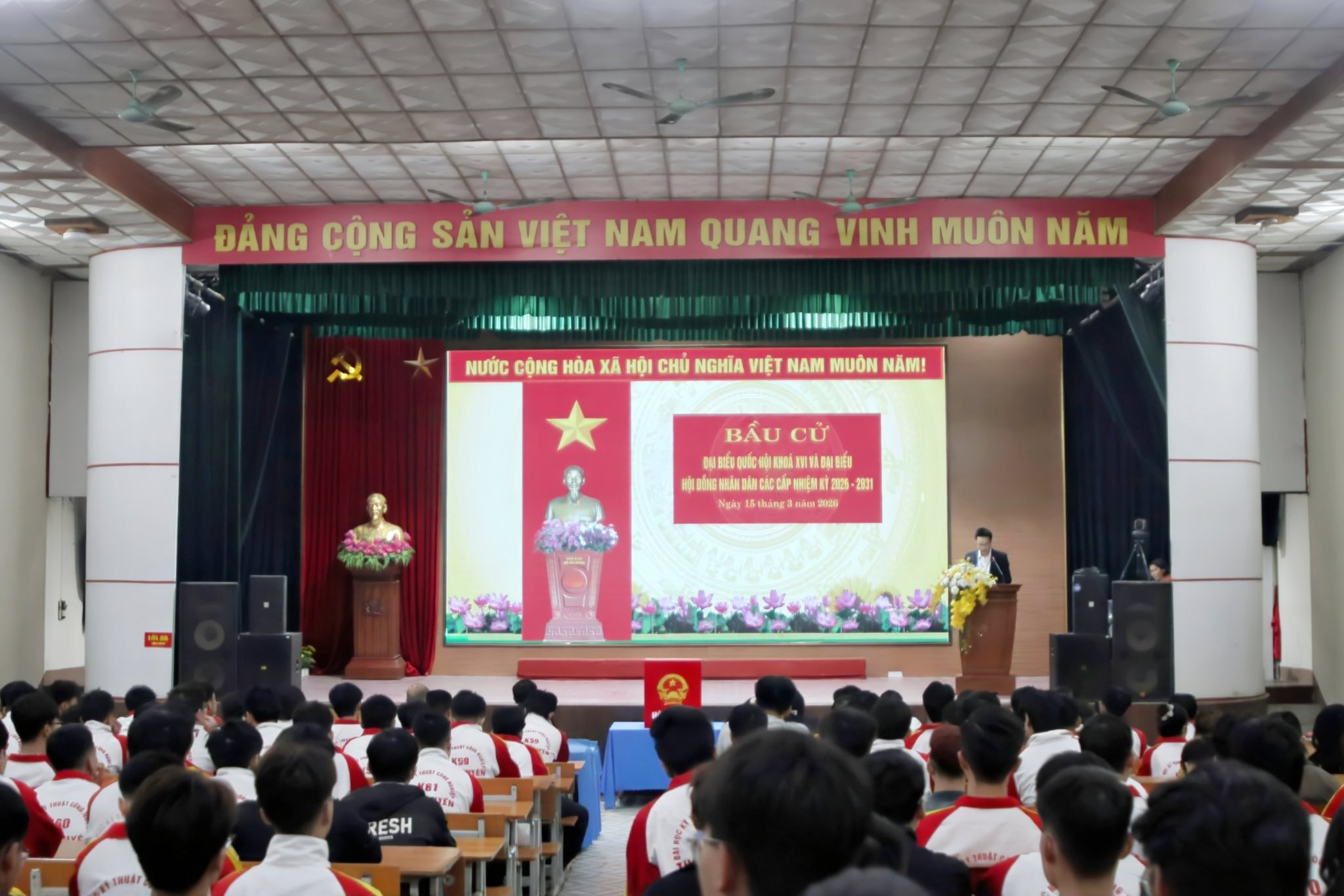 Tại khu vực bỏ phiếu đặt tại Nhà trường, công tác chuẩn bị được triển khai chu đáo, đúng quy định, bảo đảm an toàn, thuận lợi cho cử tri tham gia bỏ phiếu. Trong ngày bầu cử, trên 600 sinh viên cùng đông đảo cán bộ, giảng viên đã có mặt từ sớm để thực hiện quyền và nghĩa vụ công dân, thể hiện tinh thần trách nhiệm và ý thức chính trị cao của tuổi trẻ Nhà trường.