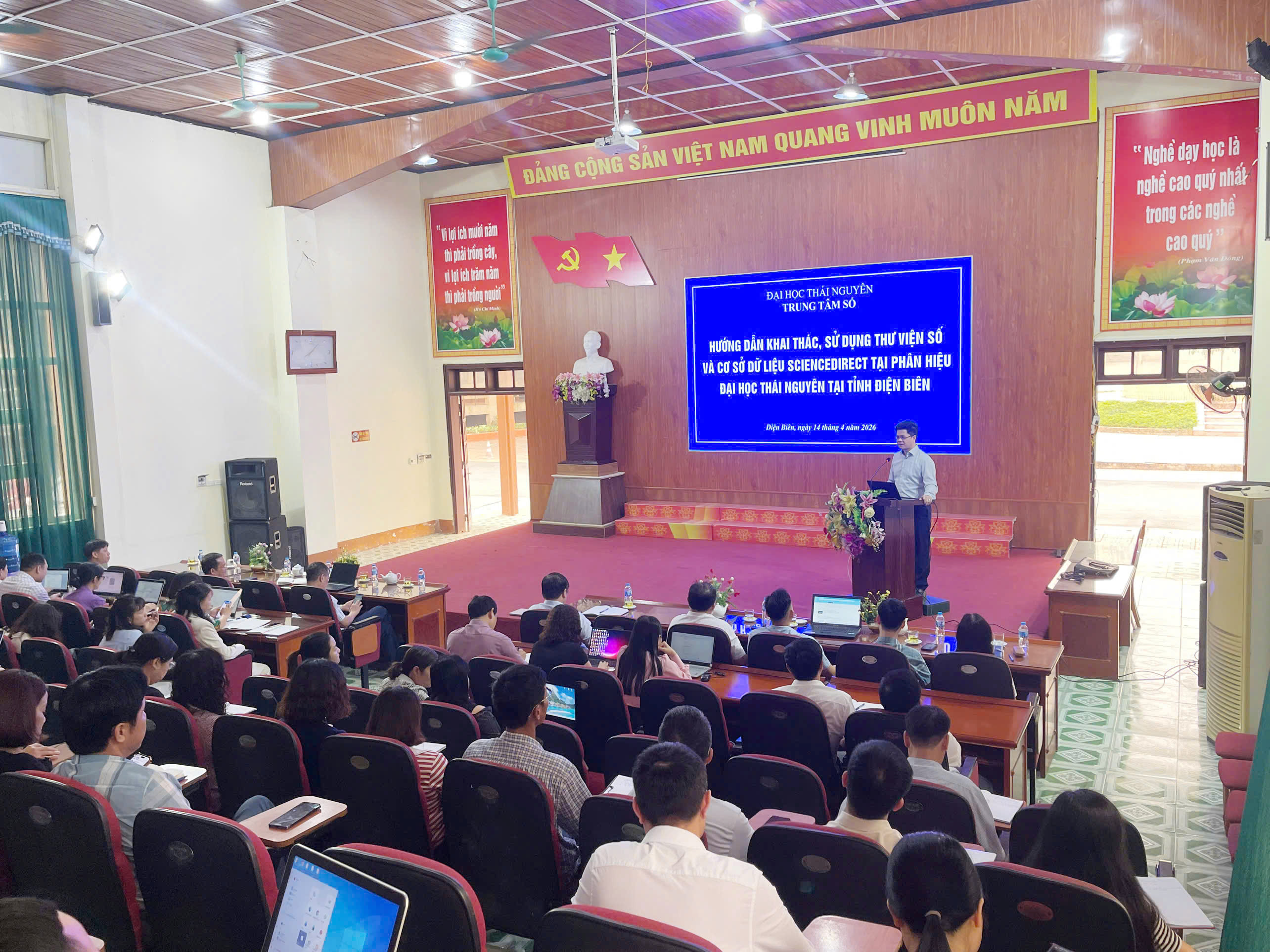 Ngày 14/04/2026, tại trụ sở Phân hiệu Đại học Thái Nguyên tại tỉnh Điện Biên, Trung tâm Số - Đại học Thái Nguyên đã tổ chức buổi tập huấn “Hướng dẫn khai thác, sử dụng thư viện số và cơ sở dữ liệu Science Direct”. Tham dự buổi tập huấn có đoàn công tác của Đại học Thái Nguyên, Ban Giám đốc Phân hiệu Đại học Thái Nguyên tại tỉnh Điện Biên và toàn thể cán bộ, giảng viên Phân hiệu.