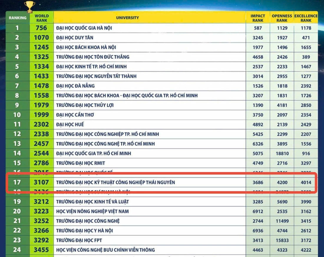 Năm 2026, Trường Đại học Kỹ thuật Công nghiệp (Đại học Thái Nguyên) ghi dấu mốc quan trọng khi vươn lên vị trí thứ 17 toàn quốc trên bảng xếp hạng Webometrics.