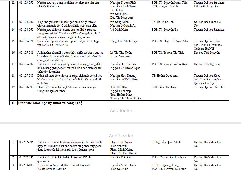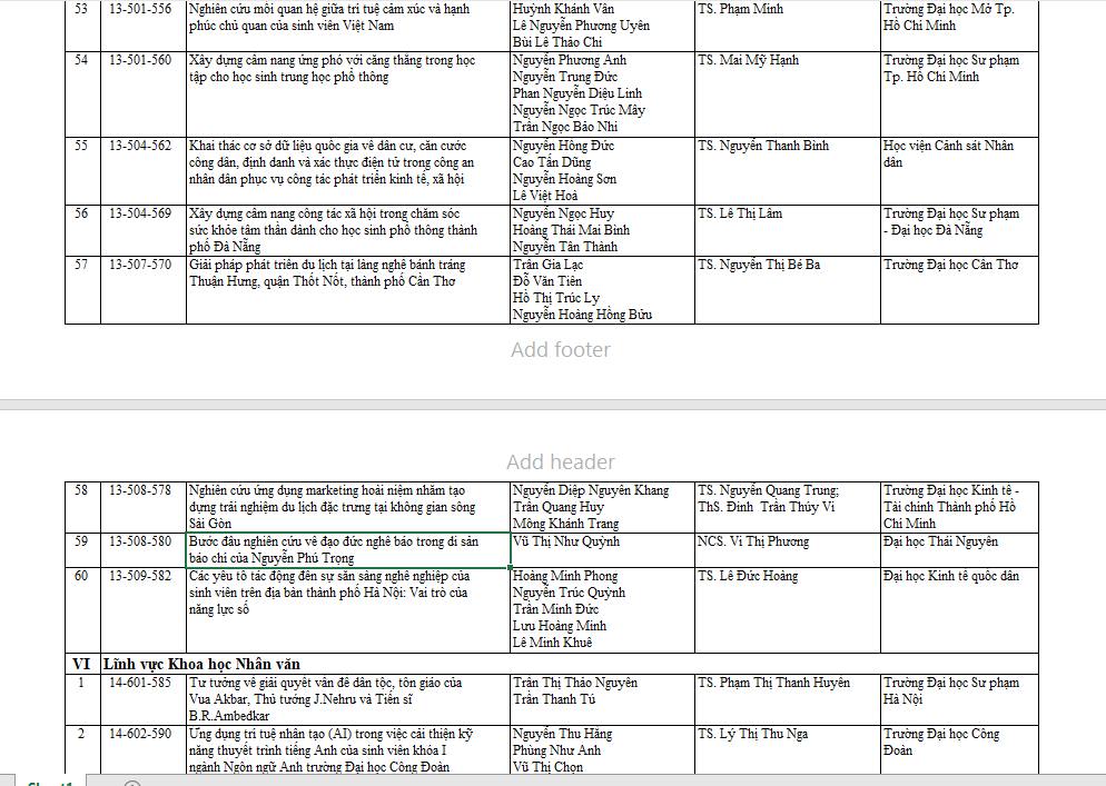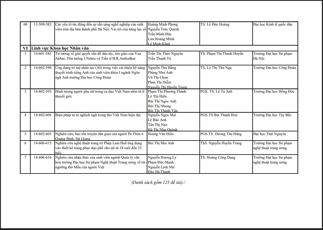 Các đề tài gồm: Đề tài Ảnh hưởng của môi trường thủy nhiệt tới đặc trưng và khả năng hấp phụ một số chất màu của hydrochar bã chưng cất tinh dầu sả (lĩnh vực Khoa học tự nhiên) của nhóm sinh viên Lê Thị Thu Uyên, Hoàng Ngọc Ánh, dưới sự hướng dẫn của PGS.TS. Trương Thị Thảo, Trường ĐH Khoa học; Đề tài Nghiên cứu khả năng cố định kim loại nặng trong đất ô nhiễm bằng quặng apatit và than sinh học điều chế từ thân cây dọc mùng (lĩnh vực Khoa học tự nhiên) của nhóm sinh viên Nguyễn Đức Phương, Nguyễn Vũ Huyền Ngọc, dưới sự hướng dẫn của PGS.TS. Vương Trường Xuân, Trường ĐH Khoa học; Đề tài Bước đầu nghiên cứu về đạo đức nghề báo trong di sản báo chí của Nguyễn Phú Trọng (lĩnh vực Khoa học xã hội) của sinh viên Vũ Thị Như Quỳnh, dưới sự hướng dẫn của NCS. Vi Thị Phương, Trường Đại học Khoa học; Đề tài Nghiên cứu, bảo tồn truyện dân gian của người Pà Thẻn ở Quang Bình, Hà Giang (lĩnh vực Khoa học nhân văn) của sinh viên Hoàng Văn Hiếu, dưới sự hướng dẫn của PGS.TS. Dương Thu Hằng, Trường Đại học Sư phạm.
