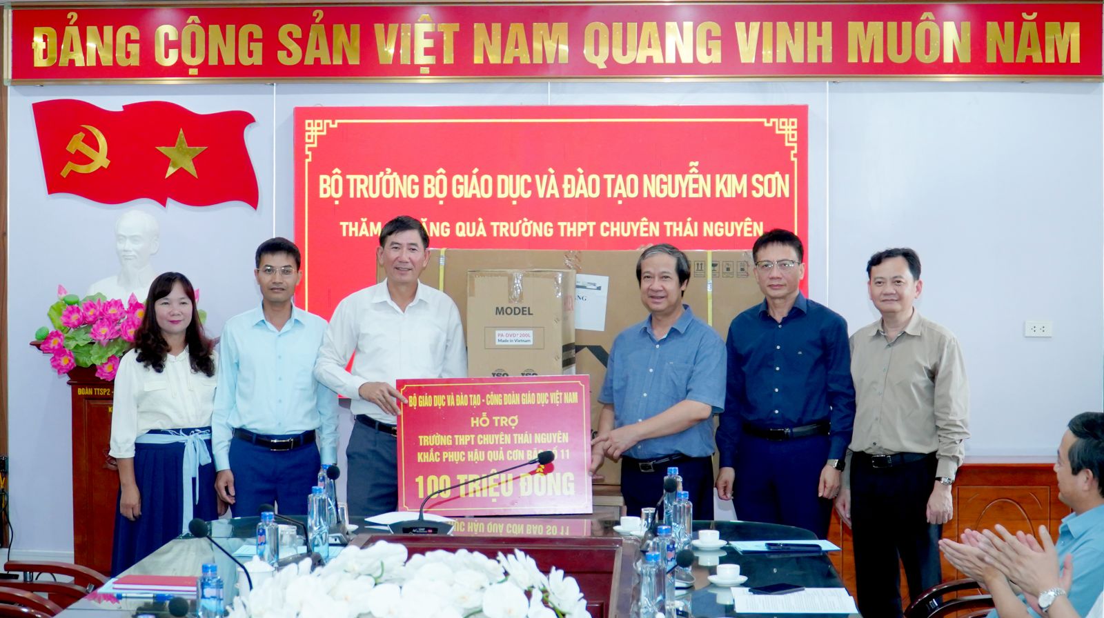 Đoàn công tác của Bộ đã tặng Trường THPT Chuyên Thái Nguyên 100 triệu đồng hỗ trợ cho công tác khắc phục hậu quả lũ lụt.