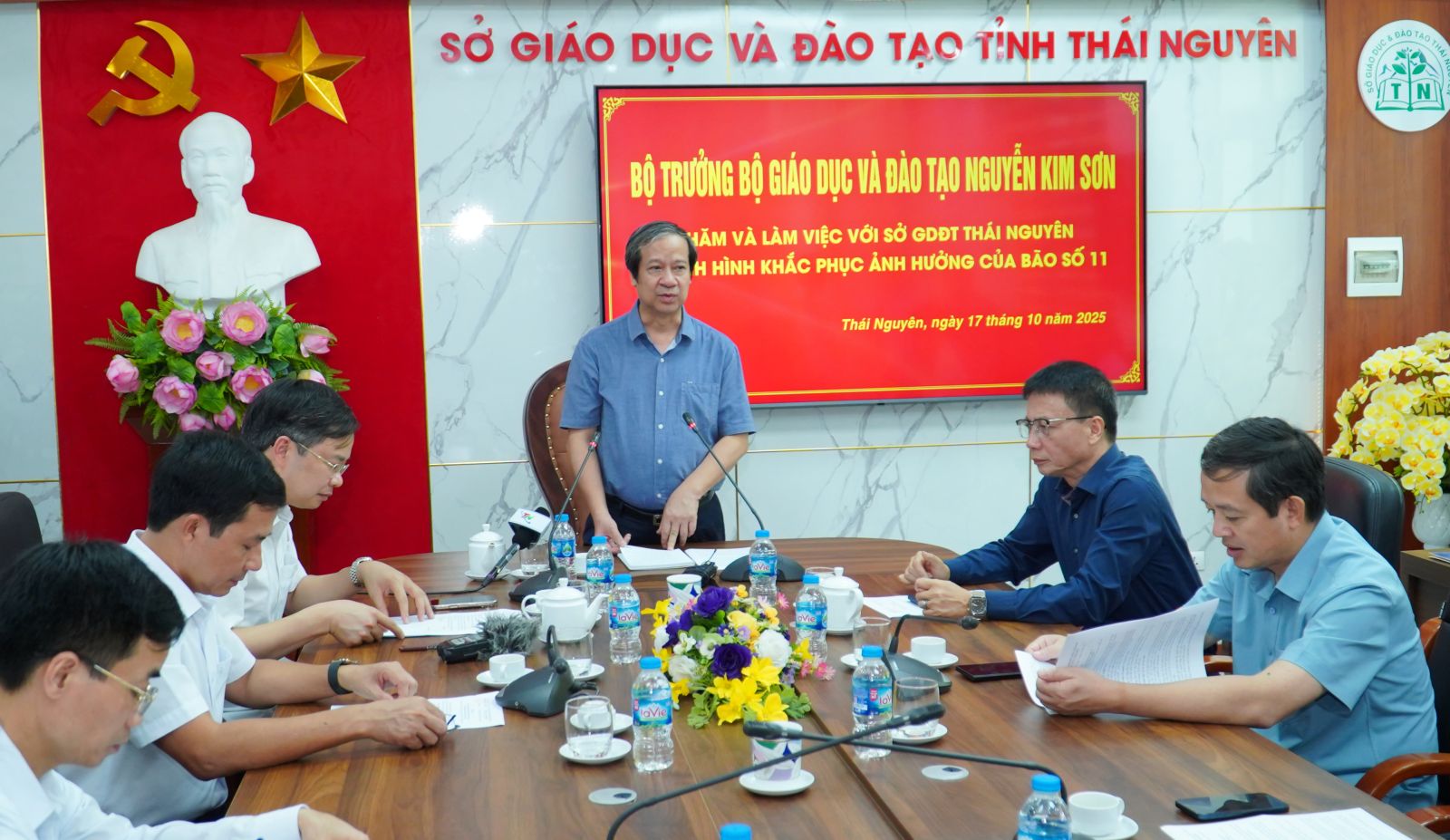 Chia sẻ với những khó khăn của tỉnh Thái Nguyên và ngành Giáo dục và Đào tạo địa phương sau ảnh hưởng của cơn bão số 11, đồng chí Bộ trưởng Bộ Giáo dục và Đào tạo cũng gửi lời cảm ơn lãnh đạo tỉnh đã quan tâm đến sự nghiệp Giáo dục và Đào tạo trên địa bàn, trong đó có cả sự quan tâm, ủng hộ với Đại học Thái Nguyên là đơn vị thuộc Bộ. Đánh giá cao sự vào cuộc của Sở Giáo dục và Đào tạo Thái Nguyên trong nỗ lực khắc phục khó khăn trước mắt. Đồng chí đề nghị tiếp tục quan tâm đảm bảo đủ số sách giáo khoa đến tay học sinh trong buổi học đầu tiên vào tuần sau. Với số lượng vở viết còn thiếu, báo cáo lãnh đạo Bộ huy động các nguồn lực hỗ trợ ngay cho Thái Nguyên, đảm bảo những điều kiện cần thiết nhất cho học sinh trở lại học tập bình thường. Tỉnh có kế hoạch tiếp tục khắc phục những thiệt hại về cơ sở vật chất do cơn bão số 11 vừa gây ra.