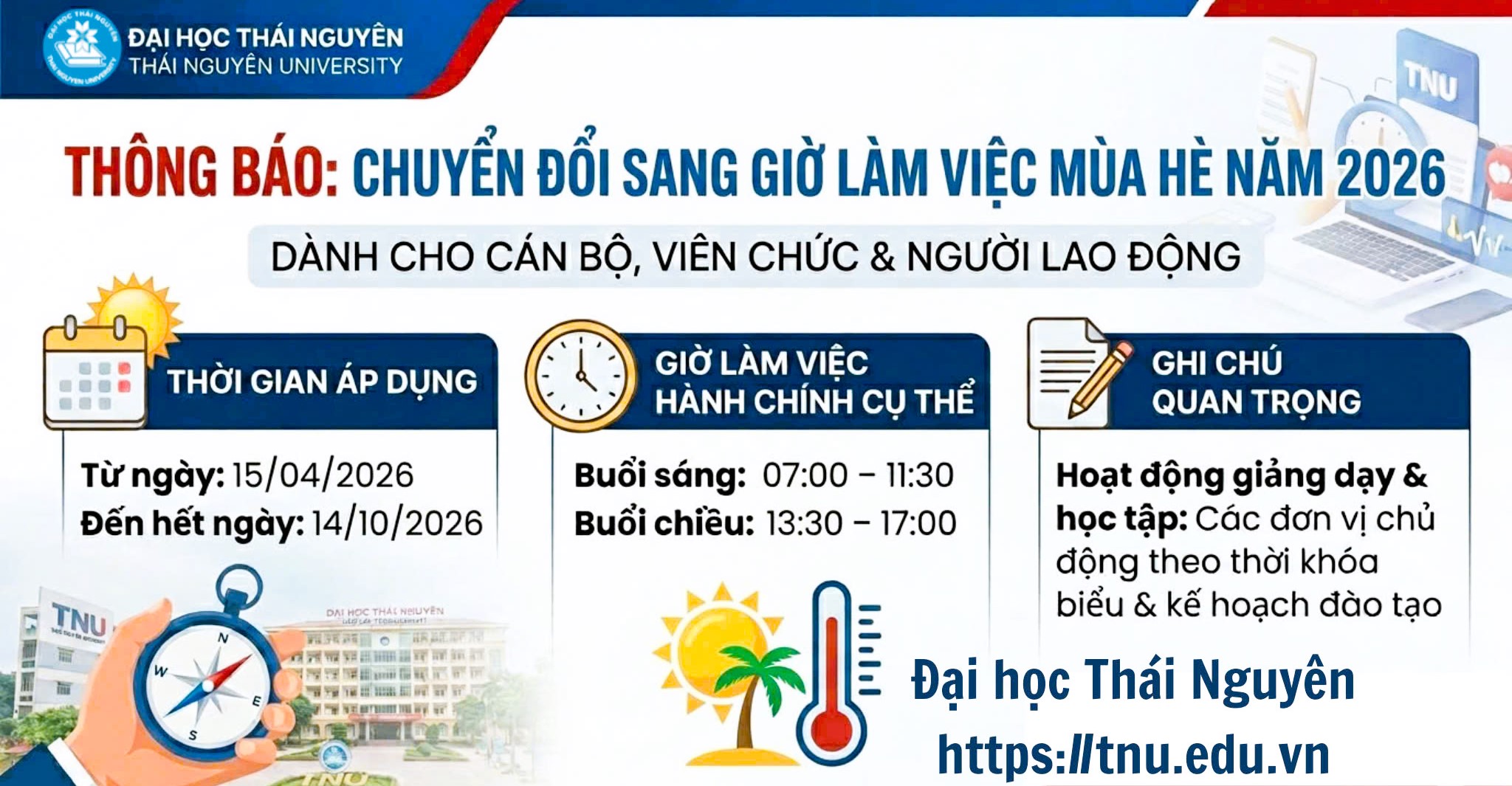 Bảng giờ làm việc mùa hè 2026 của Đại học Thái Nguyên
