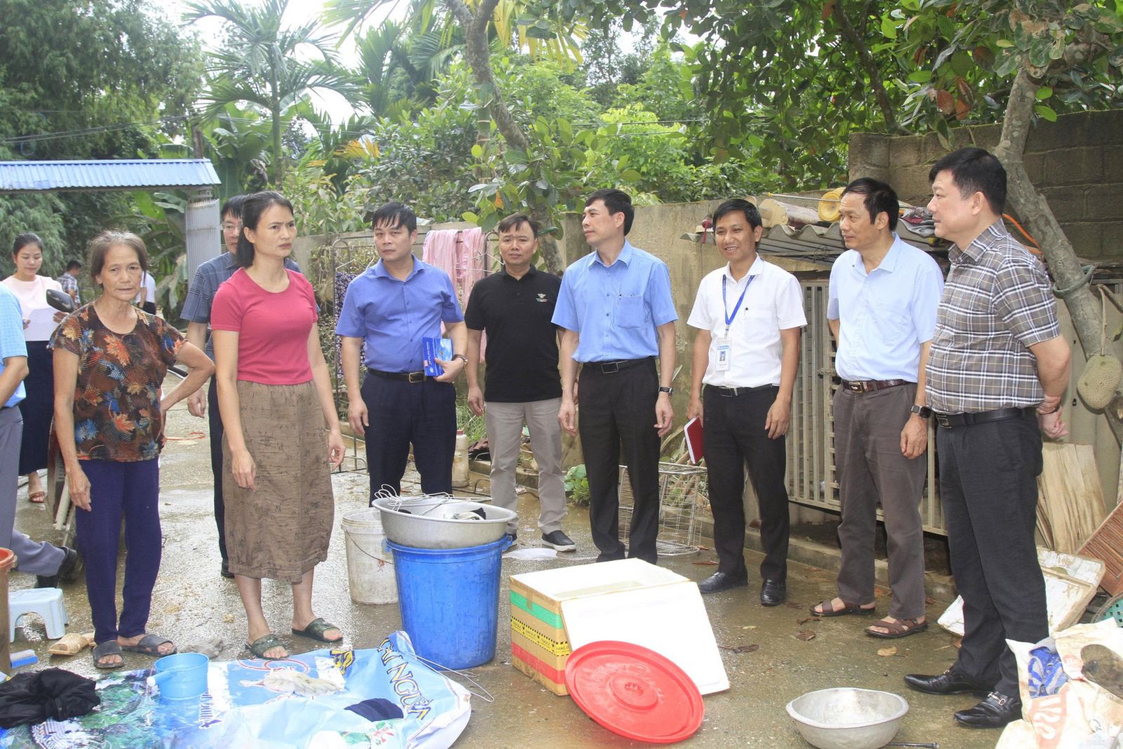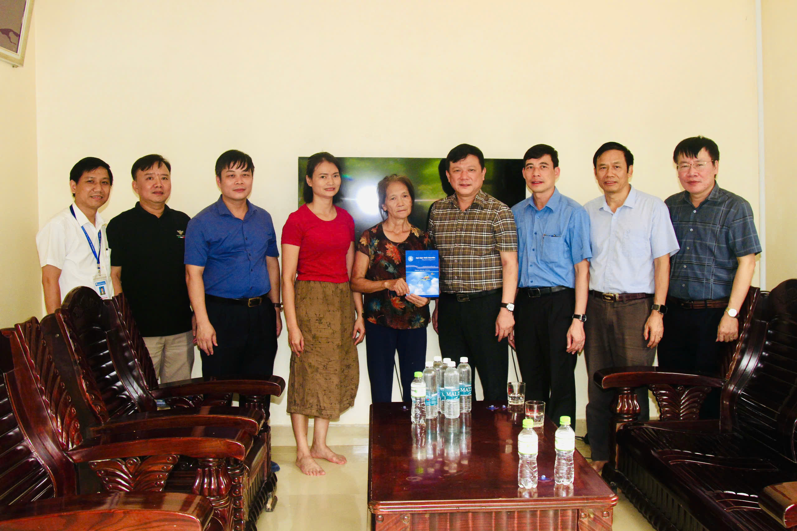 PGS.TS Hoàng Văn Hùng, Giám đốc Đại học Thái Nguyên và đoàn công tác thăm hỏi, động viên cán bộ Lê Thị Kim Ngân, chuyên viên phòng Quản lý người học và Thông tin Thư viện, Trường Đại học Kỹ thuật Công nghiệp bị thiệt hại do bão lũ.