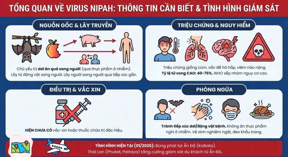 Theo khuyến cáo của Sở Y tế tỉnh Thái Nguyên, vi rút Nipah là tác nhân gây bệnh truyền nhiễm nguy hiểm, có khả năng lây từ động vật sang người và từ người sang người, tỷ lệ tử vong cao nếu không được phát hiện, điều trị kịp thời. Ngành y tế khuyến cáo các cơ quan, đơn vị cần tăng cường giám sát, chủ động phát hiện sớm các trường hợp nghi ngờ, không chủ quan, lơ là trong công tác phòng, chống dịch.