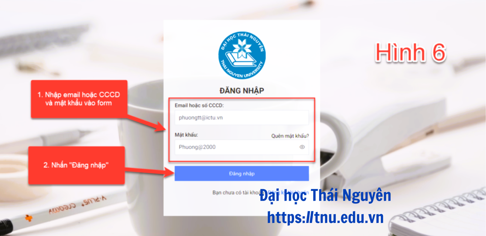 Minh họa các bước nhập thông tin tài khoản (Email/CCCD) và mật khẩu để truy cập vào hệ thống.