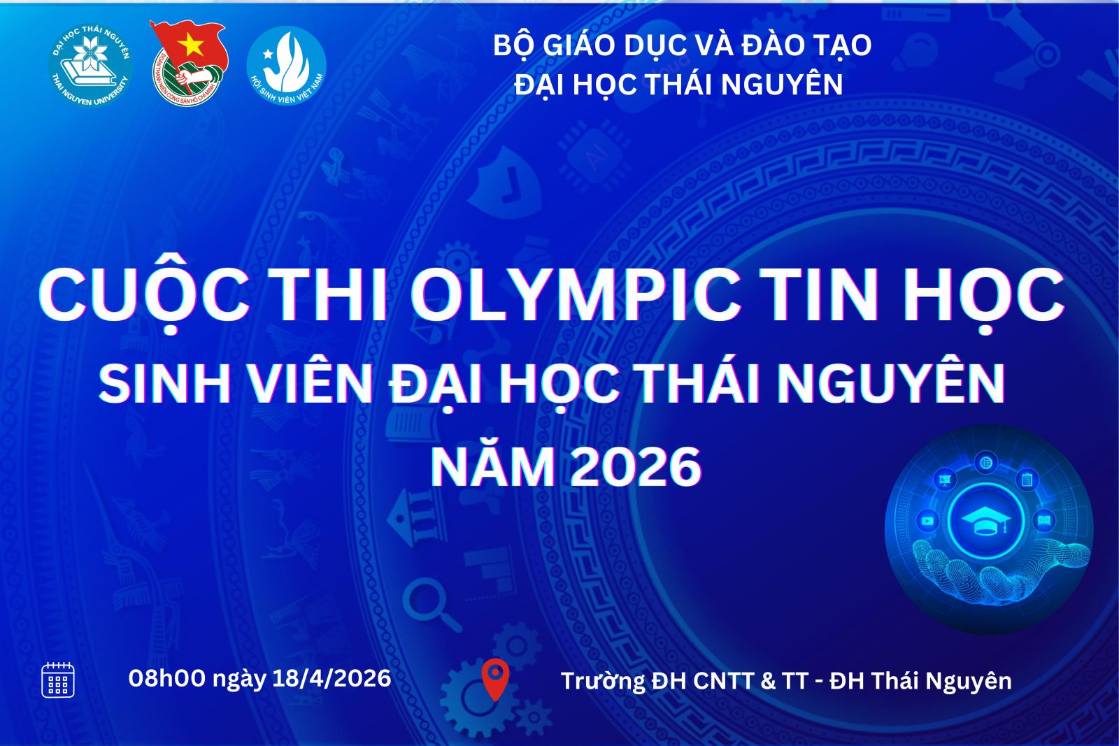 Cuộc thi Olympic Tin học sinh viên Đại học Thái Nguyên năm 2026 sẽ chính thức diễn ra vào lúc 08h00 ngày 18/4/2026 tại Trường Đại học Công nghệ Thông tin và Truyền thông.