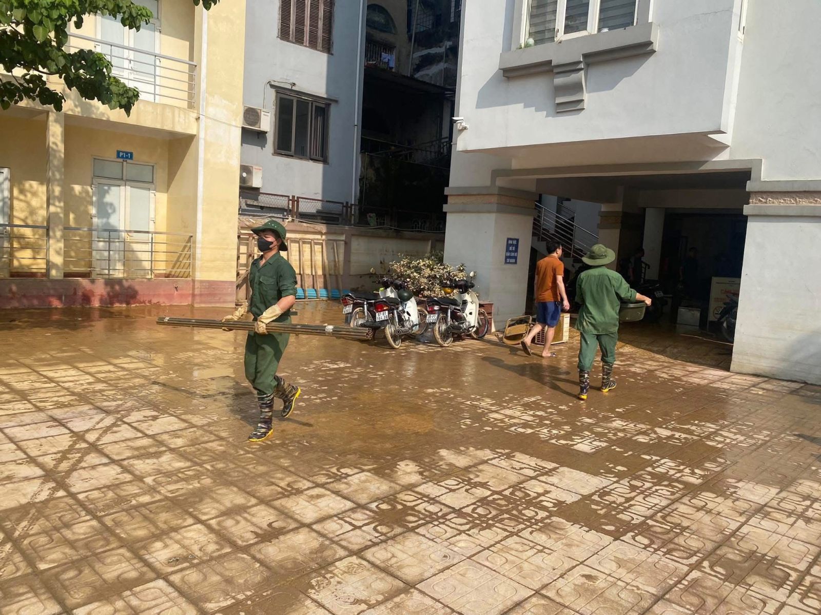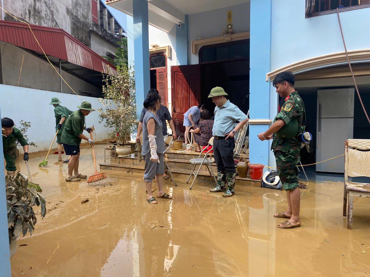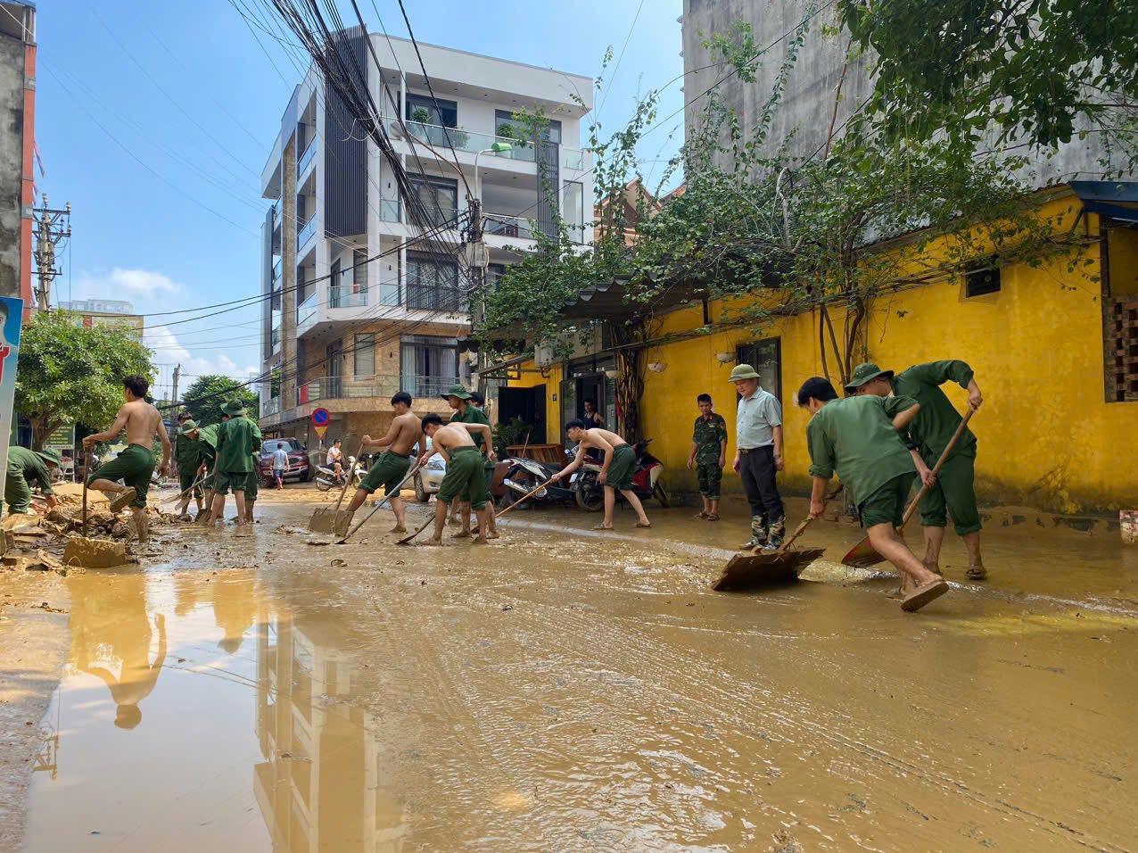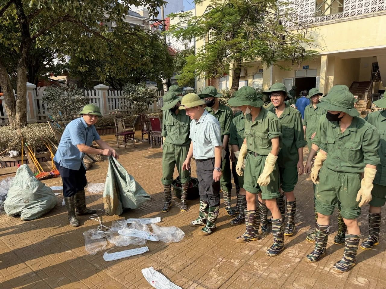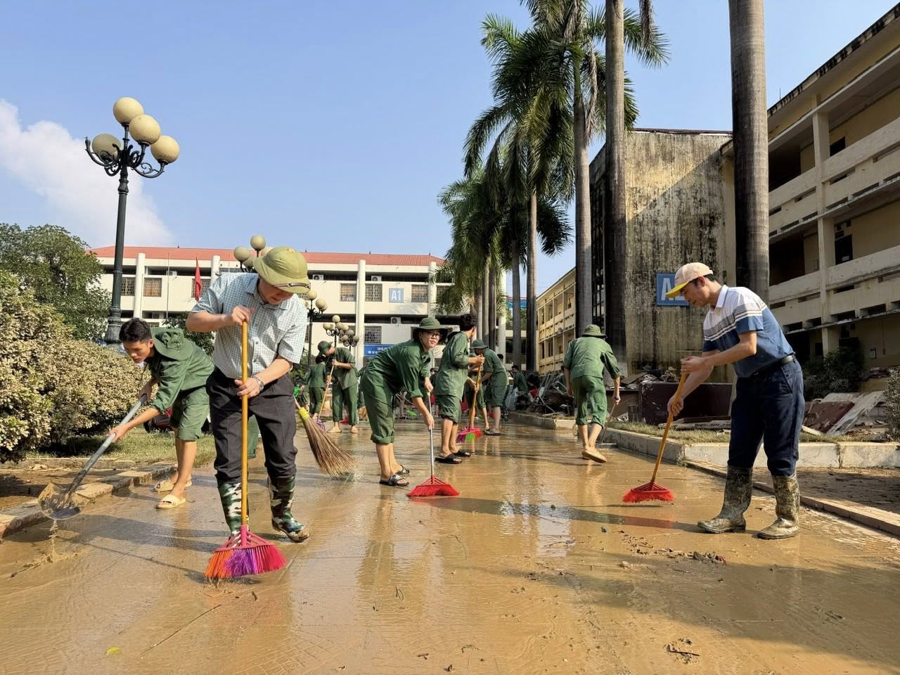 Các đội thanh niên, sinh viên tình nguyện của Trung tâm Giáo dục Quốc phòng và An ninh hỗ trợ thu dọn bùn đất tại khu dân cư.