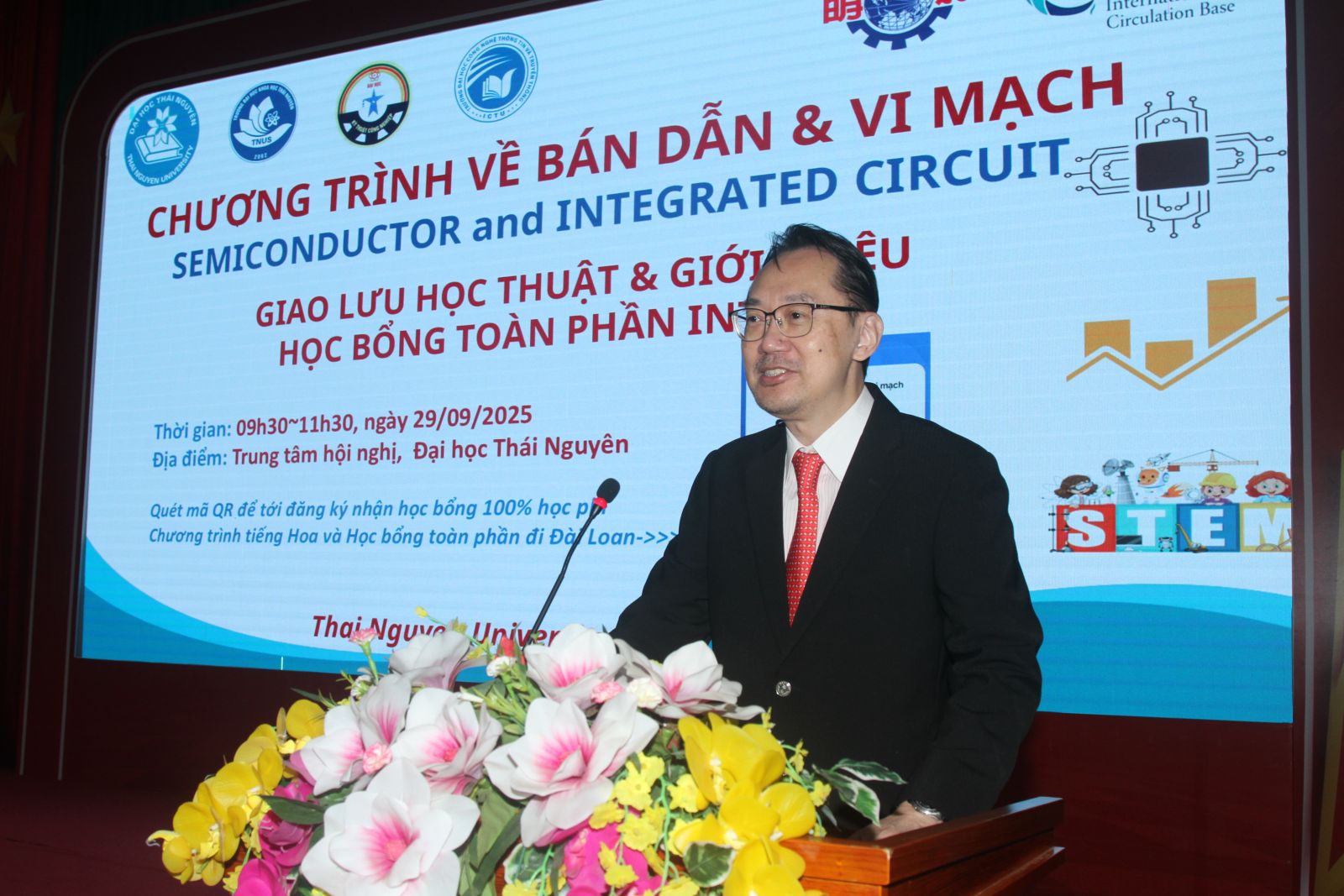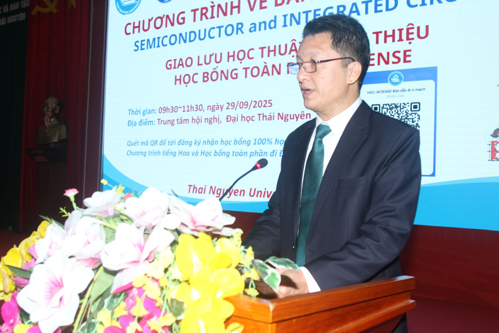 Phát biểu tại chương trình, PGS.TS Nguyễn Thanh Hà, Phó Chủ tịch Hội đồng Đại học Thái Nguyên cho biết: Thực hiện chủ trương của Chính phủ, Bộ Giáo dục và đào tạo về phát triển đào tạo ngành bán dẫn, Đại học Thái Nguyên là một trong các cơ sở giáo dục đại học tham gia thực hiện Chương trình "Phát triển nguồn nhân lực ngành công nghiệp bán dẫn đến năm 2030, định hướng đến năm 2050". Thời gian qua, Đại học Thái Nguyên đã quan tâm đến việc triển khai đào tạo về Vi mạch bán dẫn và các chuyên ngành liên quan. Đại học Thái Nguyên có 3 Trường đại học thành viên đang đào tạo các chuyên ngành bán dẫn (Trường ĐH Kỹ thuật Công nghiệp, Trường ĐH Khoa học và Trường ĐH Công nghệ Thông tin và Truyền thông). PGS.TS Nguyễn Thanh Hà bày tỏ cảm ơn Trường Đại học Khoa học và Kỹ thuật Minh Tân luôn sẵn sàng hỗ trợ Đại học Thái Nguyên và các trường thành viên trong việc đào tạo tiếng Trung miễn phí cho sinh viên và cán bộ với học bổng toàn phần INTENSE.