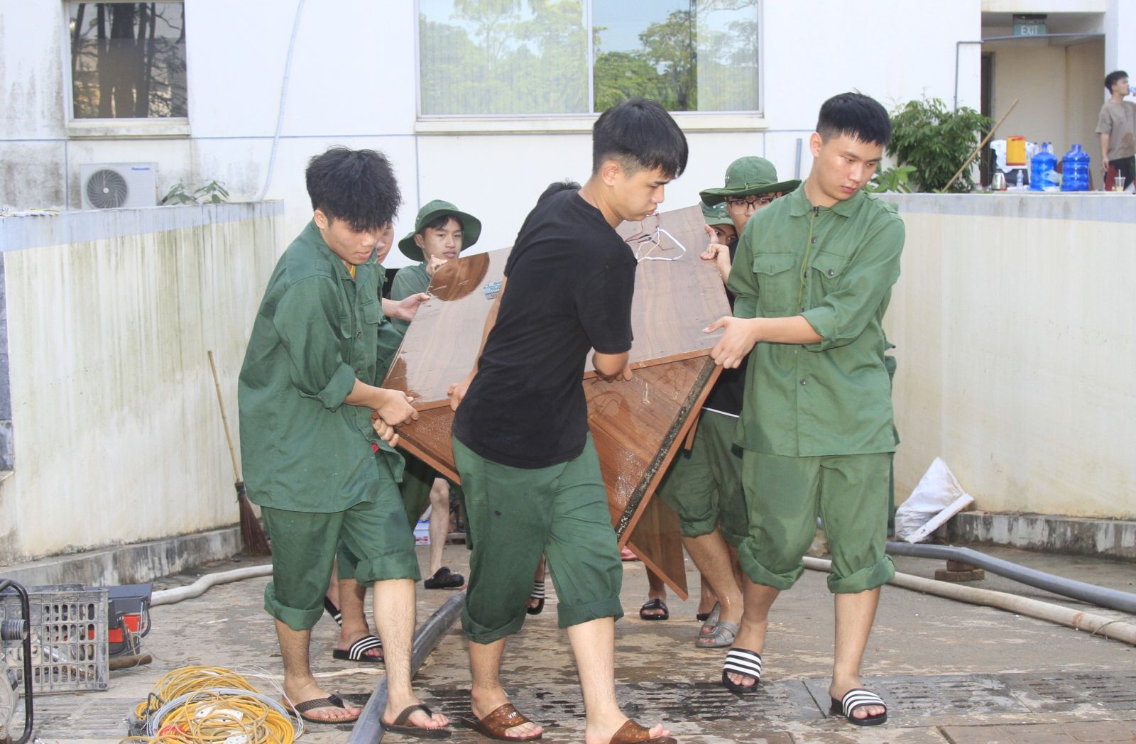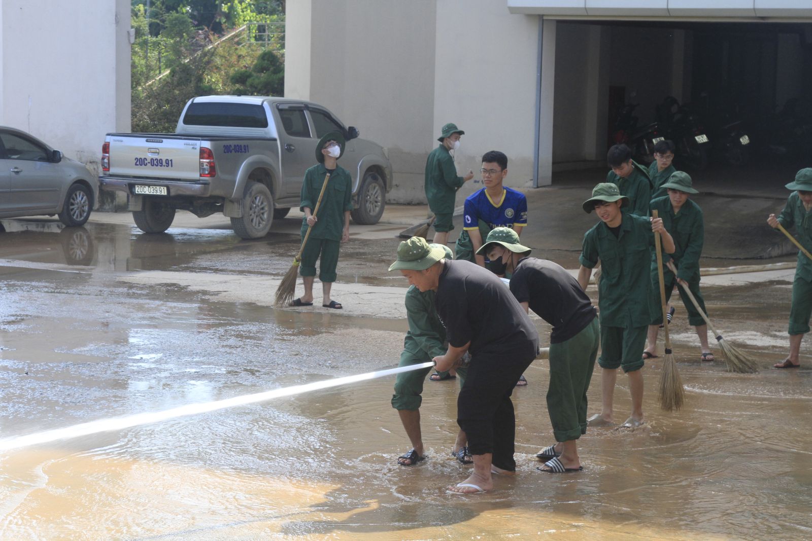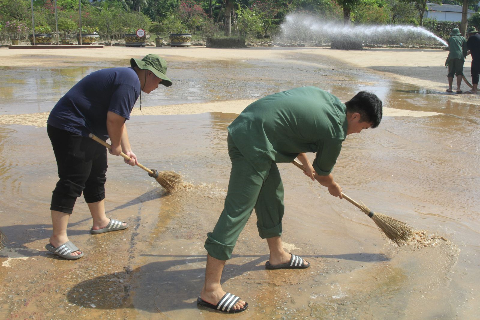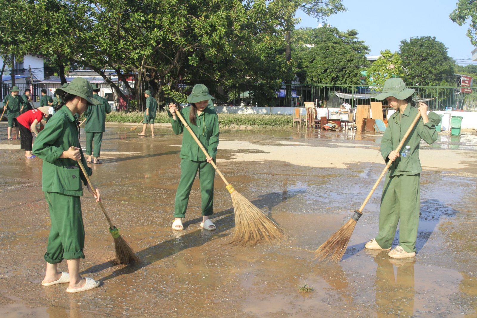 Các đội hình tình nguyện cùng nhau thu dọn bùn đất, mang lại diện mạo sạch đẹp cho khuôn viên trường