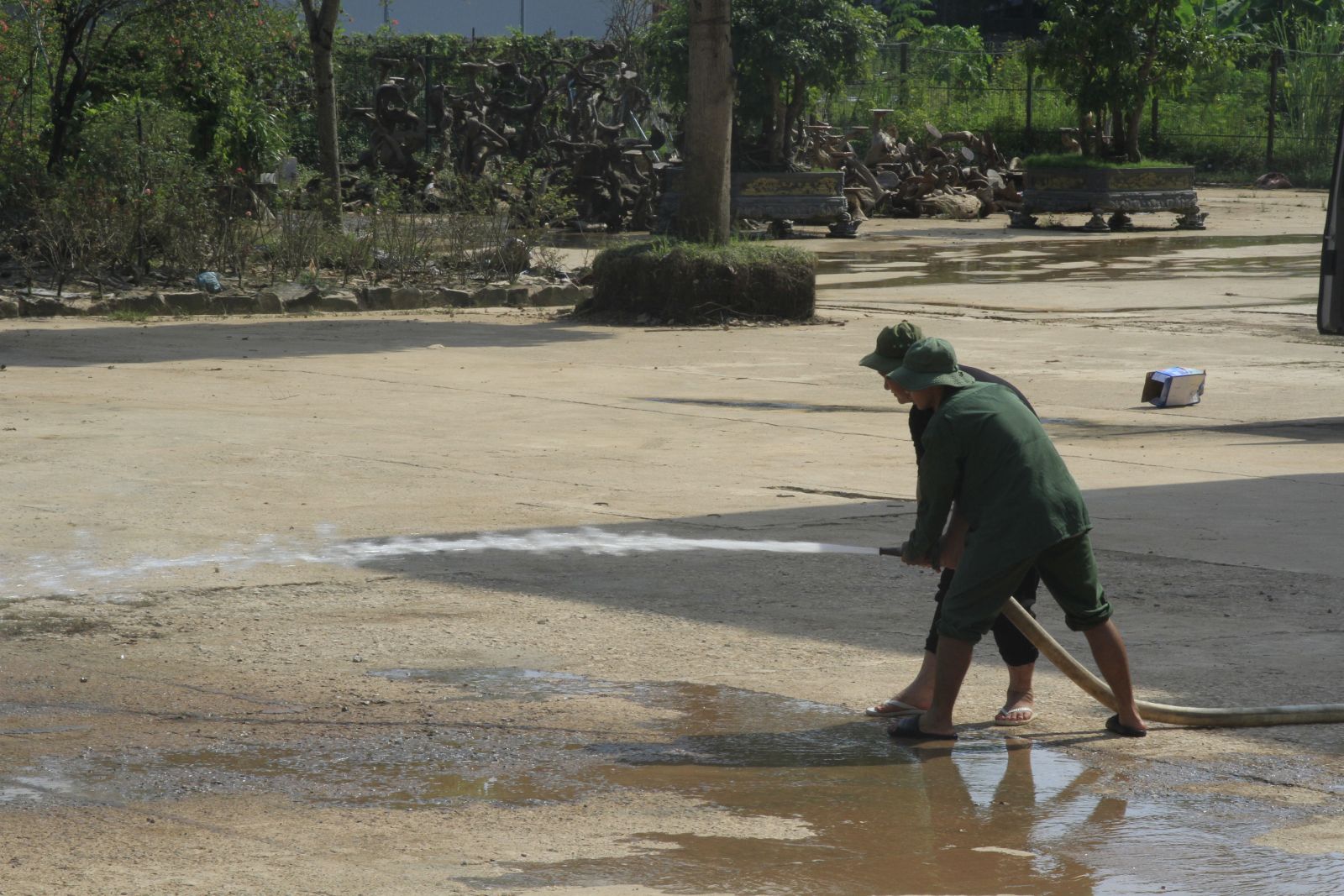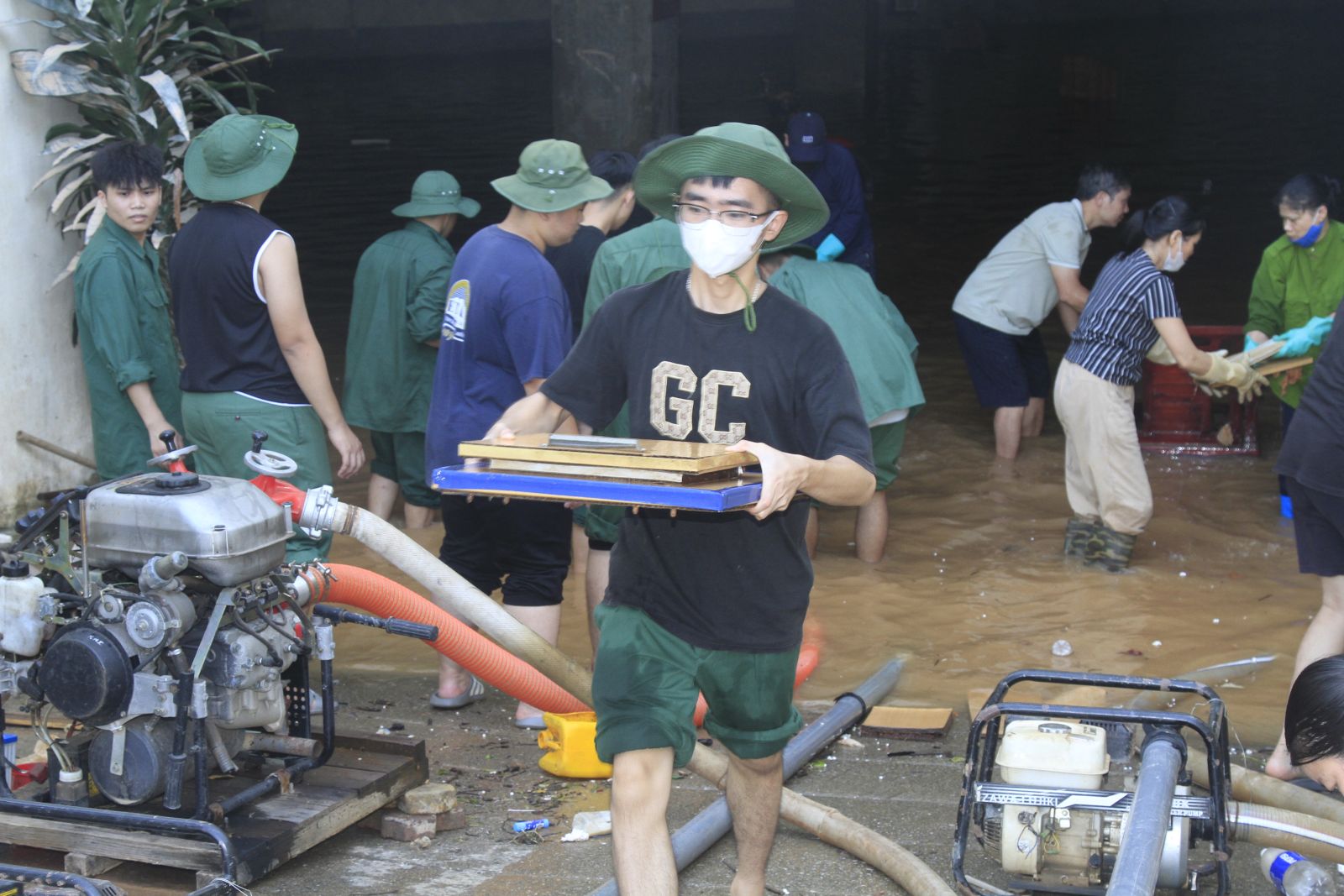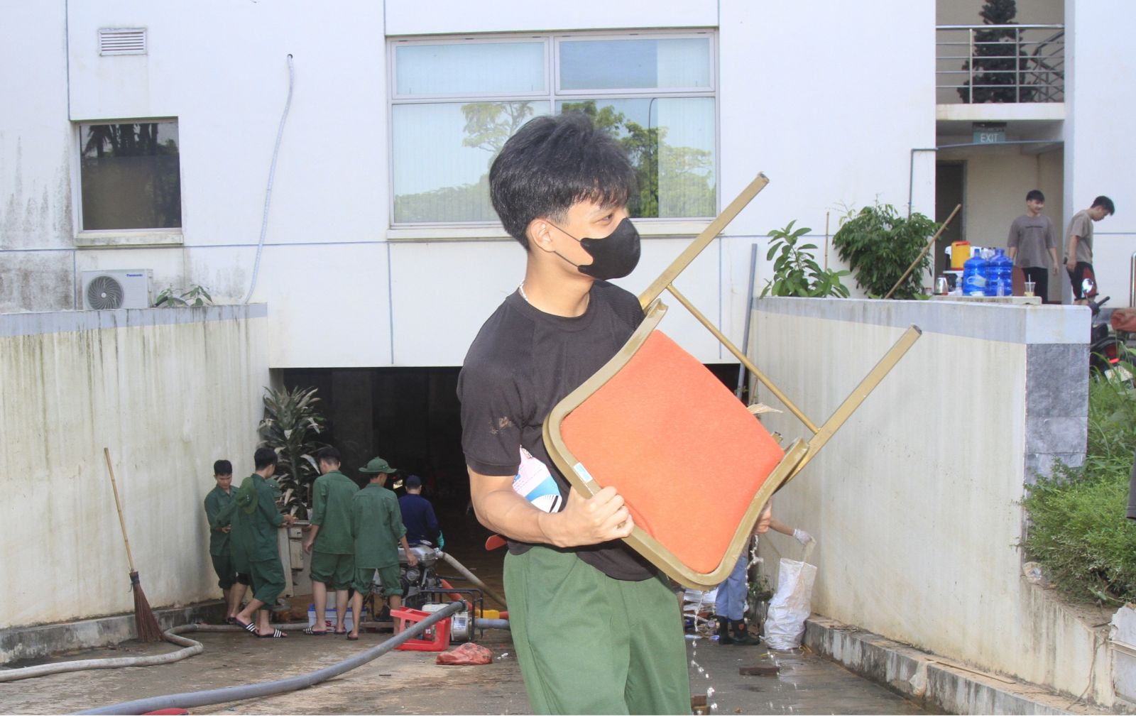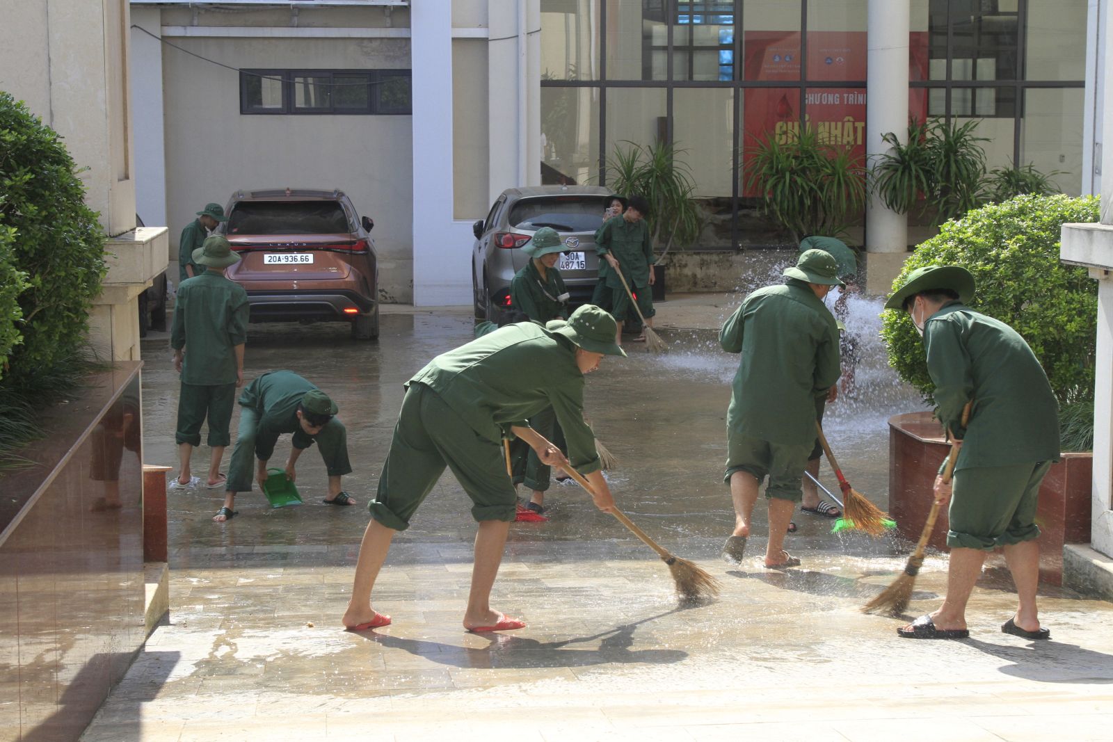 Các đội hình tình nguyện cùng nhau thu dọn bùn đất, mang lại diện mạo sạch đẹp cho khuôn viên trường