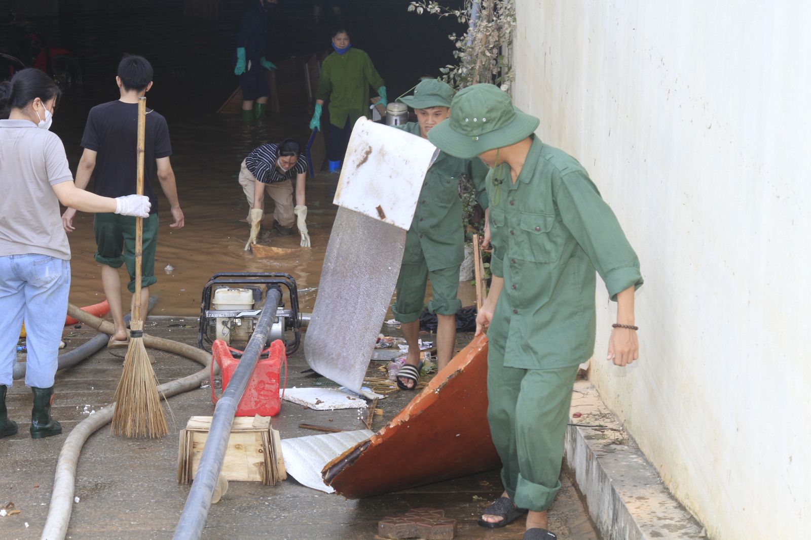 Các bạn tình nguyện viên dùng chổi và dụng cụ làm sạch khu vực bị bùn đất, rác thải bao phủ