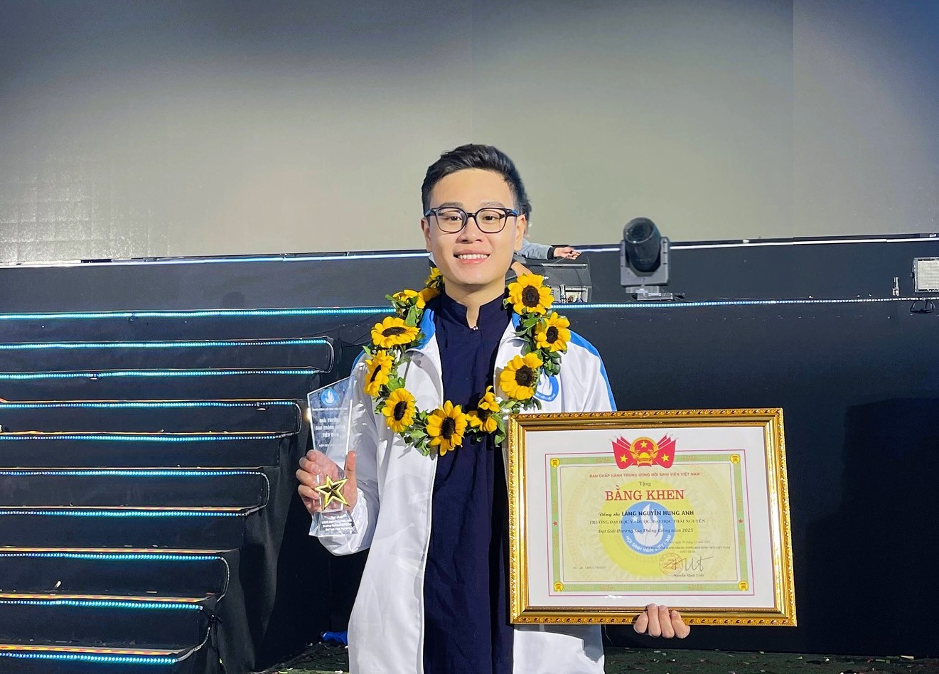 Đồng chí Nguyễn Minh Triết, Bí thư Thường trực Ban Chấp hành Trung ương Đoàn, Chủ tịch Trung ương Hội Sinh viên Việt Nam và đồng chí Nguyễn Xuân Định, Phó Chủ tịch Trung ương Hội Nông dân Việt Nam trao giải thưởng "Sao tháng Giêng" năm học 2024 - 2025 cho sinh viên Lăng Nguyễn Hùng Anh Trường Đại học Y – Dược.