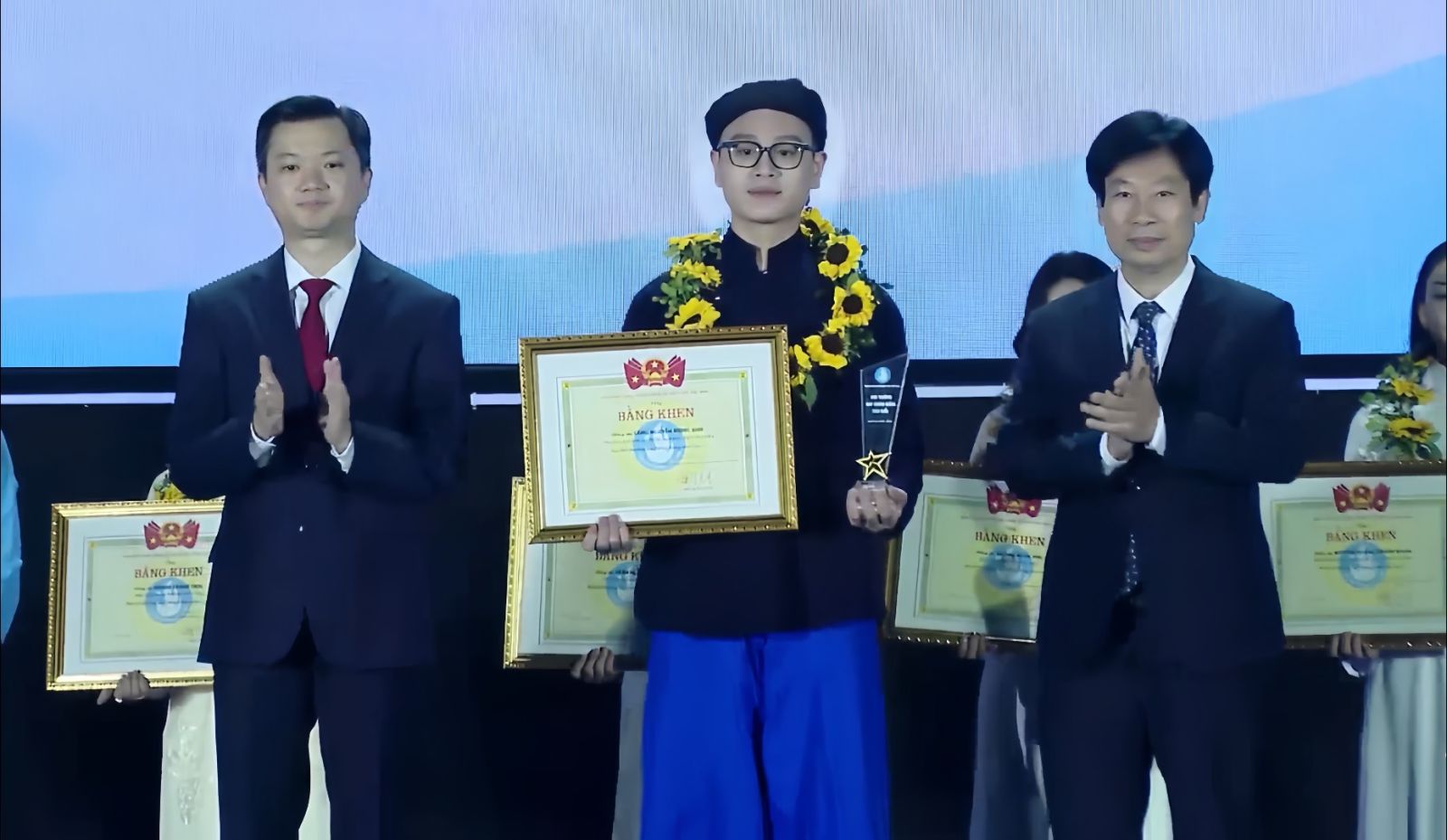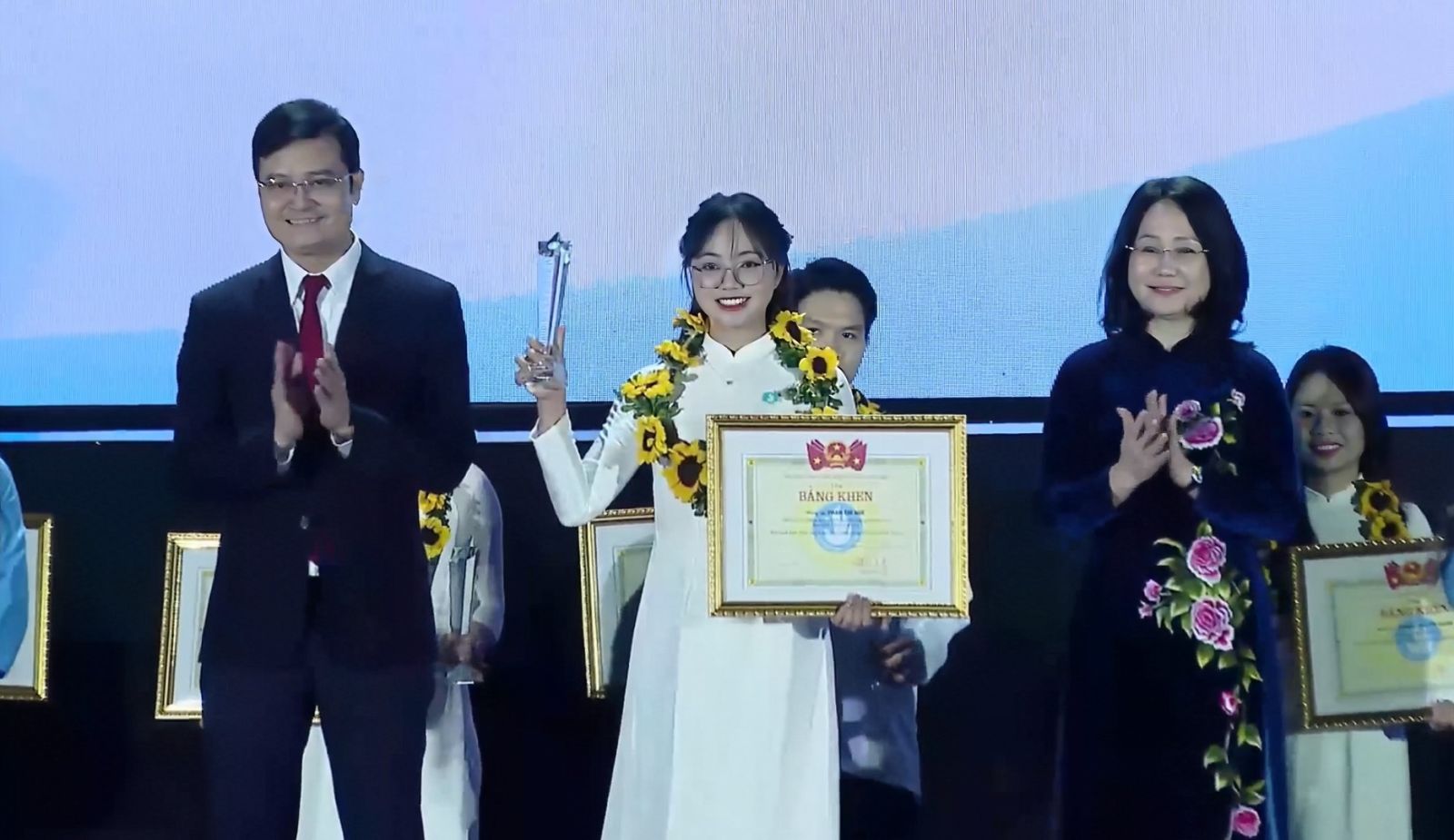 Đồng chí Lâm Phương Thanh, Ủy viên Ban Chấp hành Trung ương Đảng, Phó Chánh Văn phòng Thường trực Văn phòng Trung ương Đảng và đồng chí Bùi Quang Huy, Ủy viên Dự khuyết Ban Chấp hành Trung ương Đảng, Phó Chủ tịch Ủy ban Trung ương Mặt trận Tổ quốc Việt Nam, Bí thư thứ nhất Ban Chấp hành Trung ương Đoàn trao danh hiệu "Sinh viên 5 tốt" cấp Trung ương cho Sinh viên Phạm Thị Huế Trường Đại học Kinh tế và Quản trị kinh doanh.