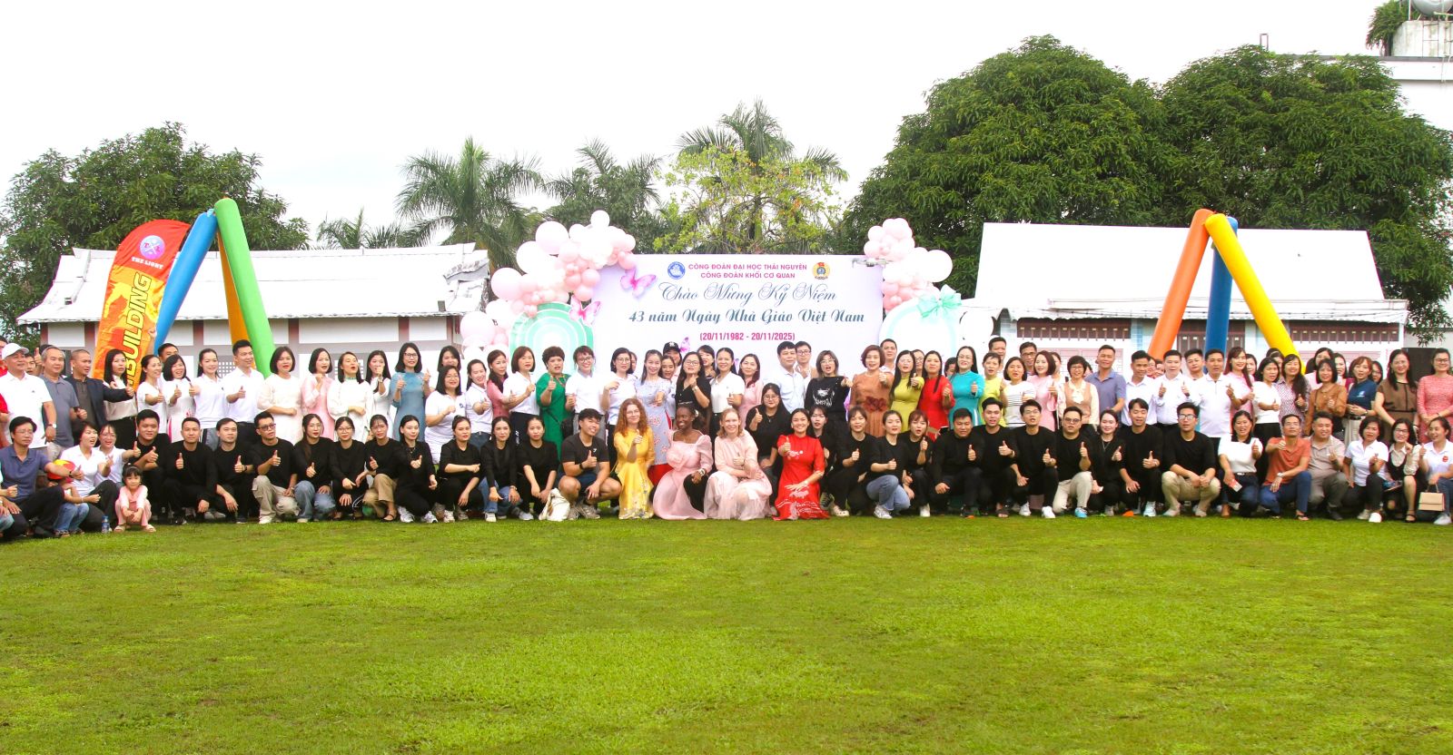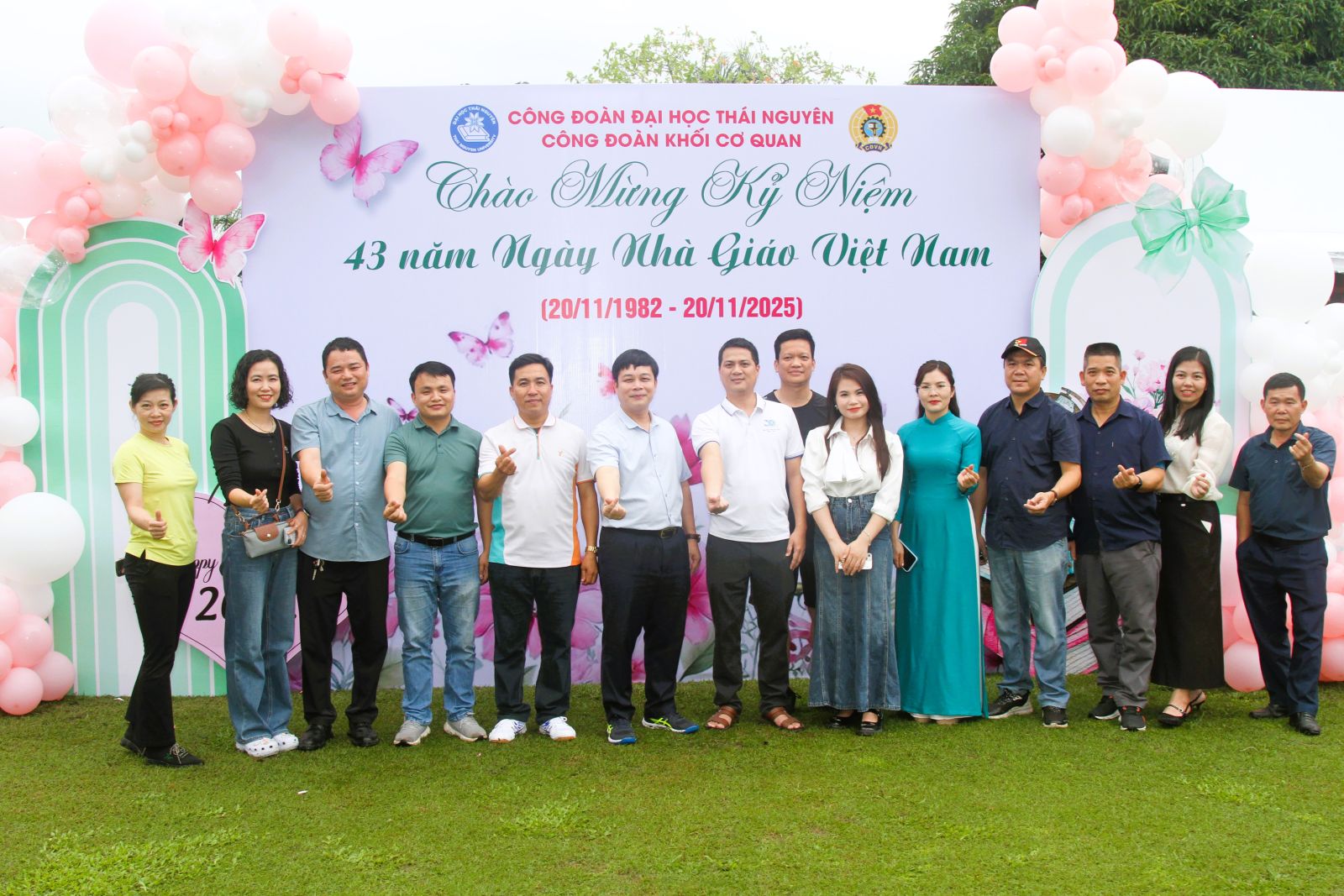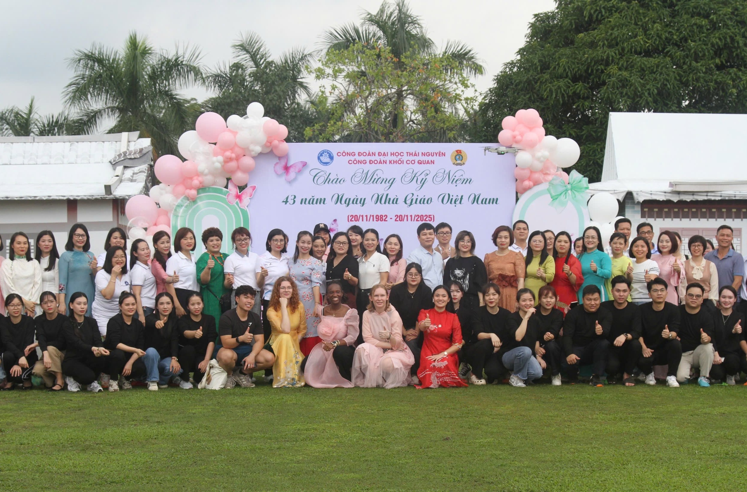 Chiều 8/11, Đại học Thái Nguyên tổ chức nhiều hoạt động ý nghĩa, sôi nổi chào mừng kỷ niệm 43 năm Ngày Nhà giáo Việt Nam (20/11/1982-20/11/2025). Đến dự chương trình có TS. Nguyễn Văn Tảo, Bí thư Đảng ủy; PGS.TS. Hoàng Văn Hùng, Phó Bí thư Đảng ủy, Giám đốc; PGS.TS. Nguyễn Thanh Hà, Phó Chủ tịch Hội đồng, Chủ tịch Công đoàn; TS. Nguyễn Hồng Liên, Phó Giám đốc cùng toàn thể cán bộ, viên chức, người lao động thuộc Công đoàn Khối Cơ quan Đại học Thái Nguyên.