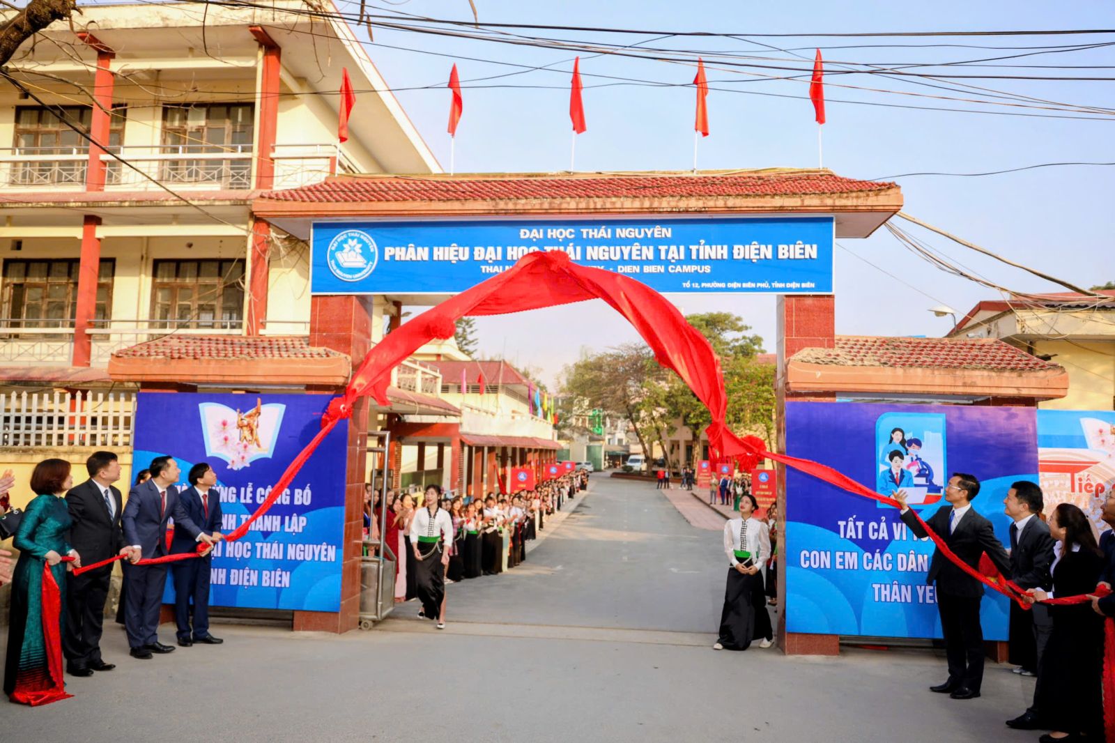 Các đại biểu thực hiện nghi thức mở biển Phân hiệu ĐHTN tại tỉnh Điện Biên.