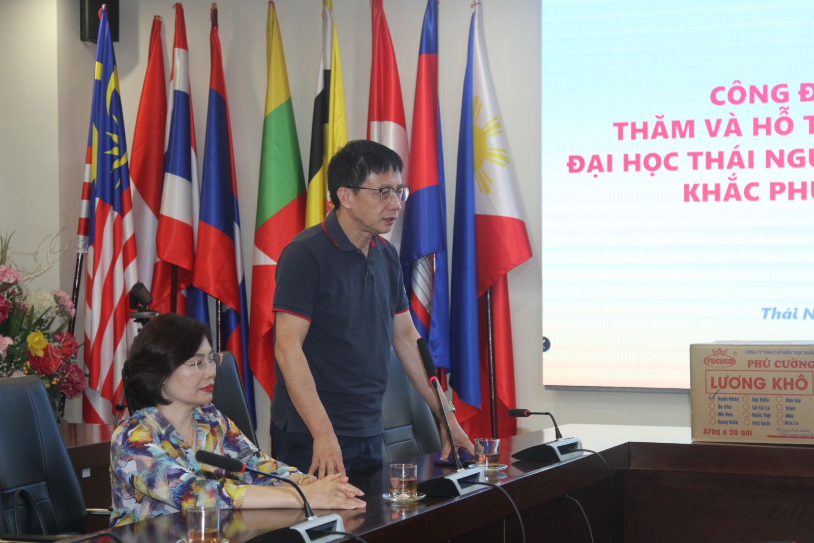 Trong những ngày qua, cơn bão số 11 với lượng mưa lớn và kéo dài đã gây ra trận lũ lụt lịch sử, gây thiệt hại nghiêm trọng trên địa bàn và ảnh hưởng nặng nề đến các đơn vị trong toàn Đại học Thái Nguyên. Phát biểu tại buổi làm việc, đồng chí Nguyễn Ngọc Ân, Chủ tịch Công đoàn Giáo dục Việt Nam đã chia sẻ với những khó khăn mà thầy và trò Đại học Thái Nguyên đã trải qua trong đợt mưa lũ vừa qua. Đồng thời, mong muốn cán bộ, giảng viên và sinh viên Đại học Thái Nguyên sớm khắc phục thiệt hại để ổn định cuộc sống, ổn định việc dạy và học.