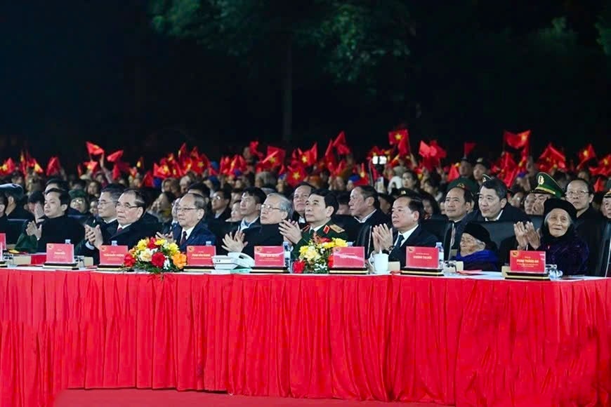 Tổng Bí thư Tô Lâm cùng các đồng chí lãnh đạo Đảng, Nhà nước dự chương trình. Nguồn: qdnd.vn