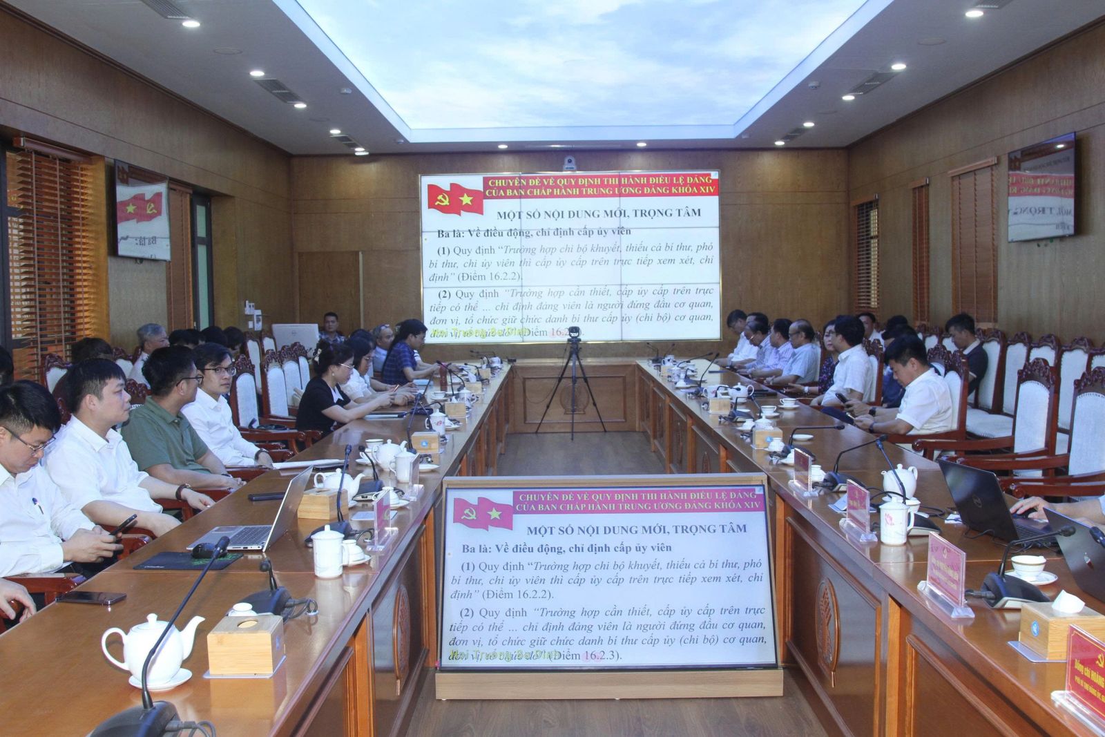 Hội nghị quán triệt nội dung cốt lõi, điểm mới, trọng tâm các Nghị quyết, Quy định, Kết luận của Hội nghị lần thứ hai Ban Chấp hành Trung ương Đảng khóa XIV gồm: Chuyên đề 1 “Quy định về thi hành Điều lệ Đảng”; Chuyên đề 2 “Nghị quyết về đổi mới, nâng cao hiệu lực công tác kiểm tra, giám sát và kỷ luật đảng; Quy định về công tác kiểm tra, giám sát và kỷ luật của Đảng”; Chuyên đề 3 “Những nội dung cơ bản của Quy định về công tác chính trị, tư tưởng trong Đảng”; Chuyên đề 4 “Nghị quyết về tiếp tục tăng cường sự lãnh đạo của Đảng đối với công tác phòng, chống tham nhũng, lãng phí, tiêu cực trong giai đoạn mới”;  Chuyên đề 5 “Kết luận về Kế hoạch phát triển kinh tế - xã hội, tài chính quốc gia và vay, trả nơi công, đầu tư công trung hạn 5 năm 2026-2030 gắn với thực hiện mục tiêu phấn đấu tăng trưởng “2 con số” ”.