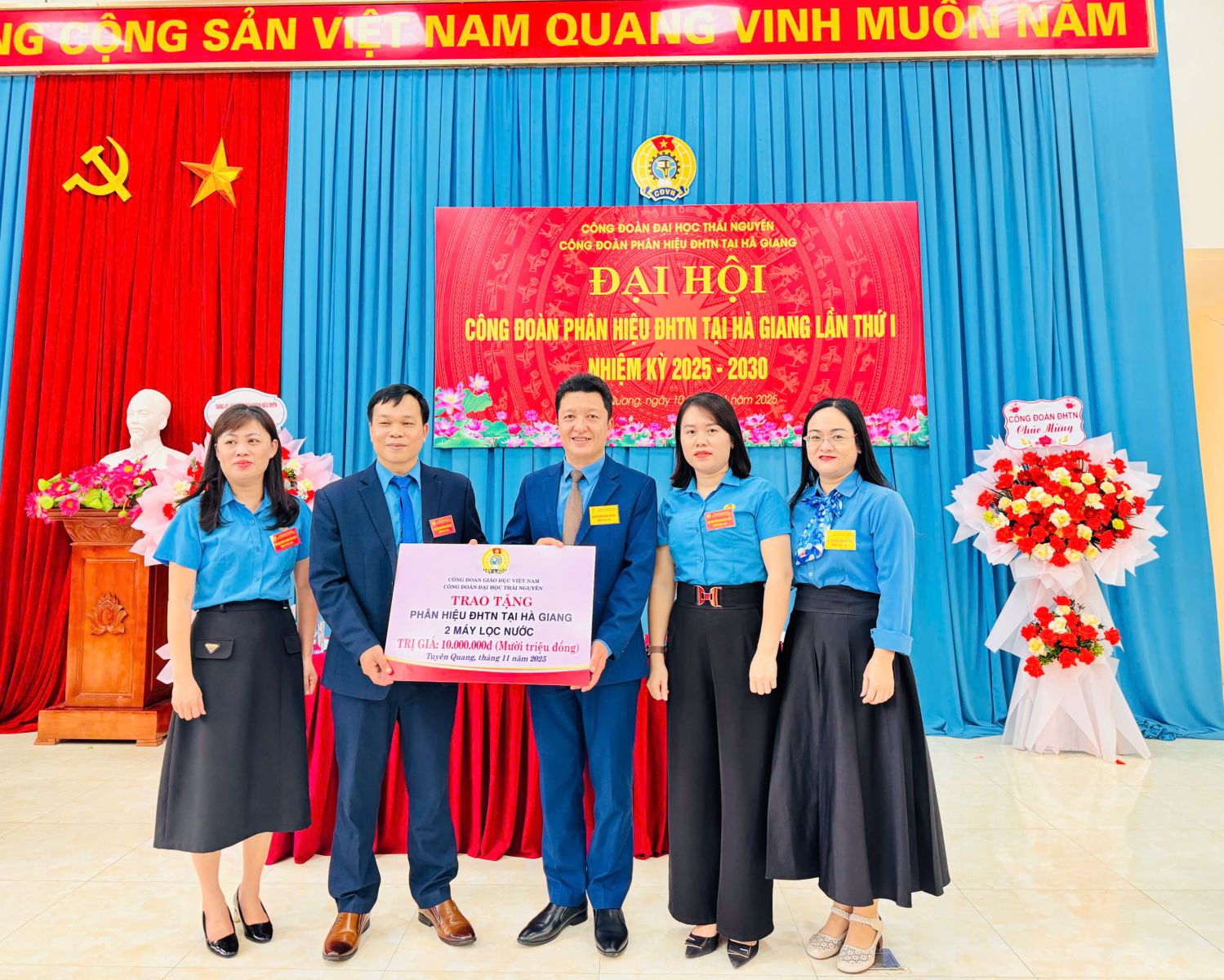Cũng trong dịp này, Công đoàn Đại học Thái Nguyên đã trao tặng 02 máy lọc nước cho Phân hiệu, cùng các phần quà động viên viên chức, người lao động Phân hiệu ĐHTN tại Hà Giang bị thiệt hại do bão số 10 (Bualoi) và bão số 11 (Matmo).