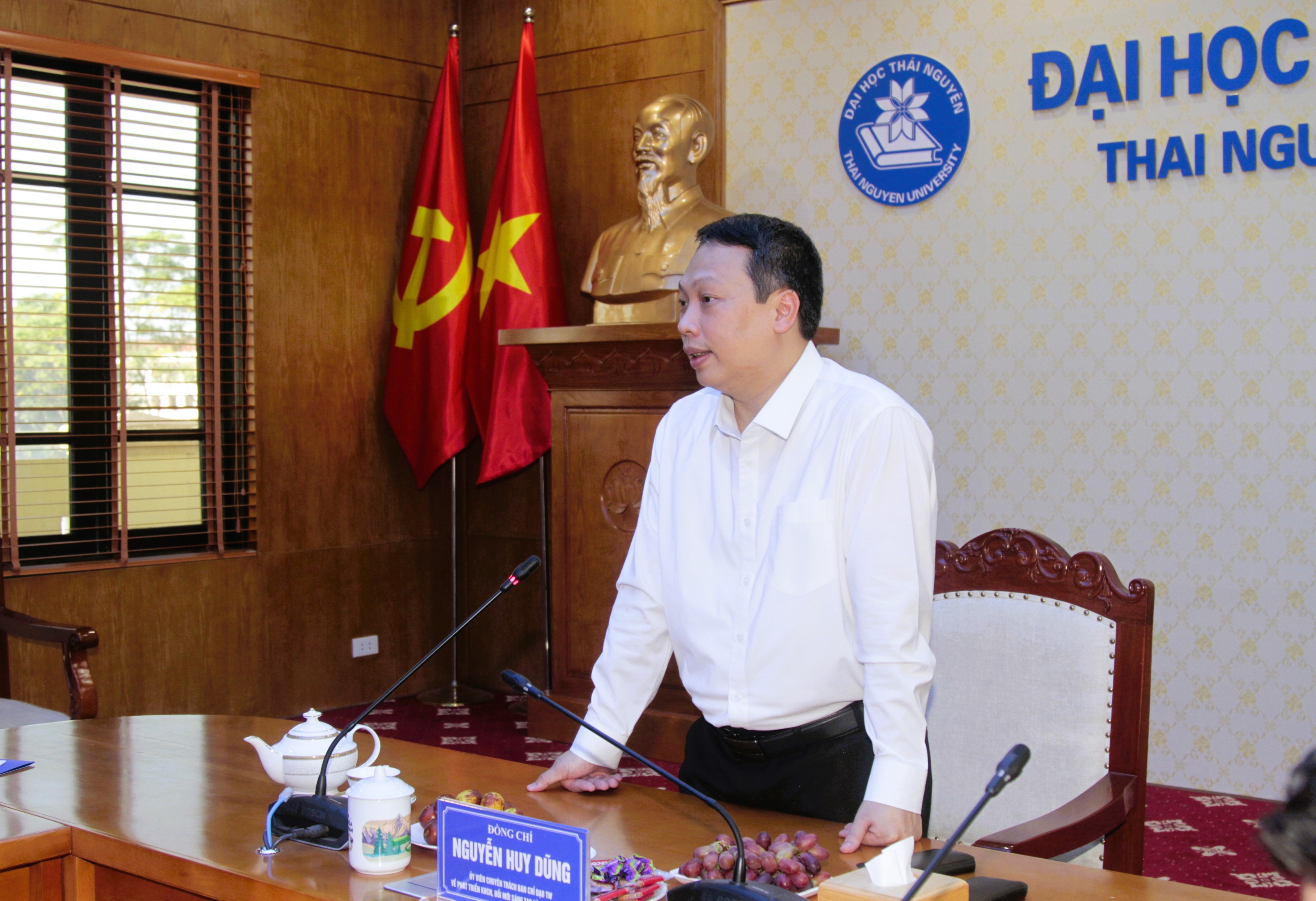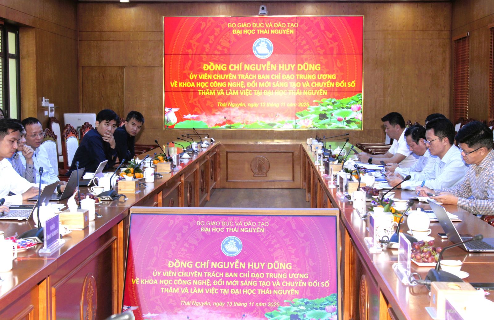 Phát biểu chỉ đạo tại buổi làm việc, đồng chí Nguyễn Huy Dũng, Ủy viên Chuyên trách Ban Chỉ đạo Trung ương về khoa học công nghệ, đổi mới sáng tạo và chuyển đổi số bày tỏ vui mừng và ghi nhận những kết quả Đại học Thái Nguyên đã đạt được trong thời gian qua, đặc biệt là trong triển khai Nghị quyết 57. Đồng chí đề nghị Đại học Thái Nguyên tiếp tục quan tâm phát triển khoa học công nghệ, đổi mới sáng tạo và chuyển đổi số tại các trường đại học thành viên; quan tâm đầu tư phim trường số trong trường đại học, từ đó lan toả thành trung tâm đổi mới sáng tạo của vùng.
