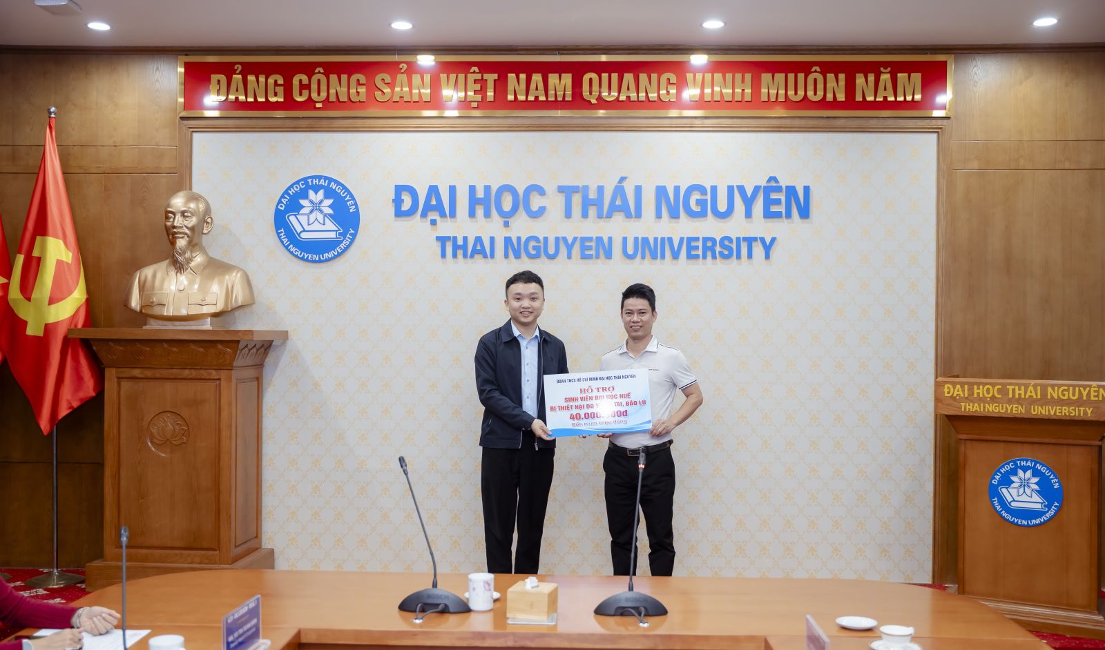 Đại diện Đoàn Thanh niên, Hội Sinh viên Đại học Thái Nguyên tặng quà hỗ trợ