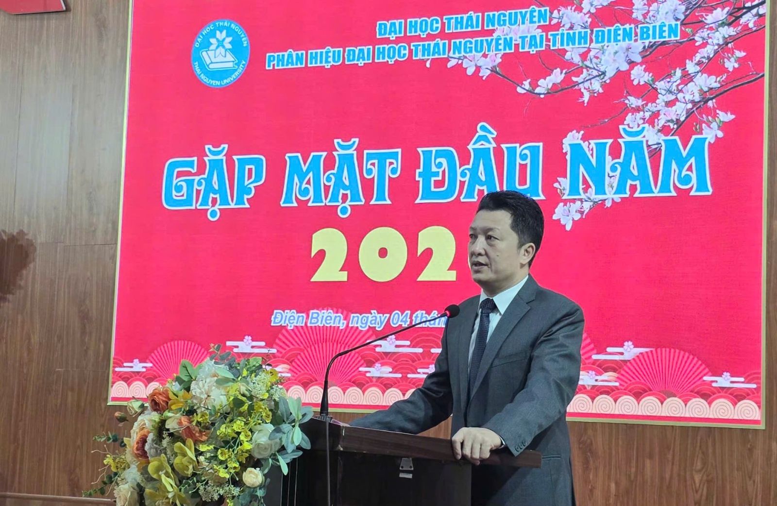 Phát biểu tại buổi gặp mặt, PGS.TS. Nguyễn Thanh Hà, Ủy viên Ban Thường vụ Đảng ủy, Chủ tịch Công đoàn Đại học Thái Nguyên, Giám đốc Phân hiệu Đại học Thái Nguyên tại tỉnh Điện Biên gửi lời chúc mừng năm mới tới toàn thể cán bộ, viên chức, người lao động; đồng thời thông tin nhanh những kết quả nổi bật của Đại học Thái Nguyên trong năm 2025. Trên cơ sở đó, đồng chí nhấn mạnh một số định hướng trọng tâm trong thời gian tới đối với Phân hiệu, như: Thúc đẩy nhiệm vụ mở ngành đào tạo phục vụ nội dung cấp phép hoạt động đào tạo cho Phân hiệu; triển khai các chủ trương, dự kiến một số định hướng đầu tư về cơ sở vật chất nhằm đảm bảo chất lượng đào tạo, nghiên cứu và quảng bá tuyển sinh. Thiết lập các hệ thống phần mềm đồng bộ với các đơn vị thuộc và trực thuộc trong Đại học Thái Nguyên, nhằm tăng hiệu quả quản trị, quản lý, phù hợp với định hướng đại học số ngay từ đầu. Nhanh chóng kiện toàn tổ chức bộ máy và nhân sự của Phân hiệu để kịp thời đi vào hoạt động ổn định và thông suốt.