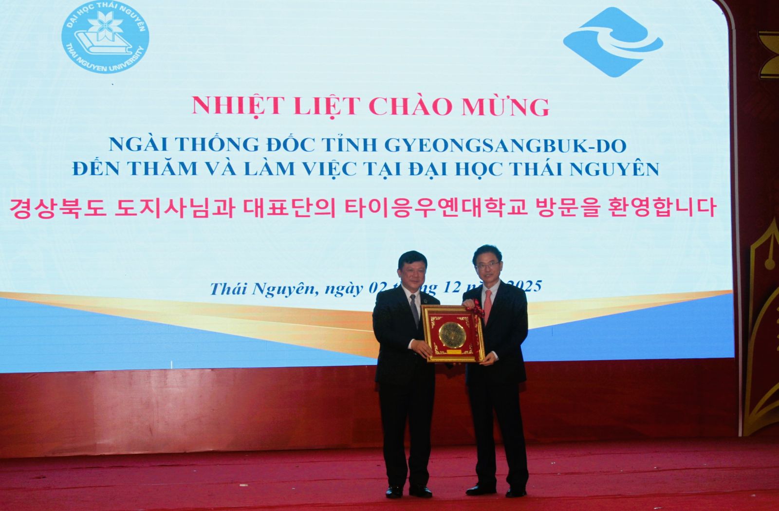 PGS.TS. Hoàng Văn Hùng, Phó Bí thư Đảng ủy, Giám đốc Đại học Thái Nguyên tặng quà lưu niệm cho Ngài Lee Cheol Woo, Thống đốc tỉnh Gyeongsangbuk-do.
